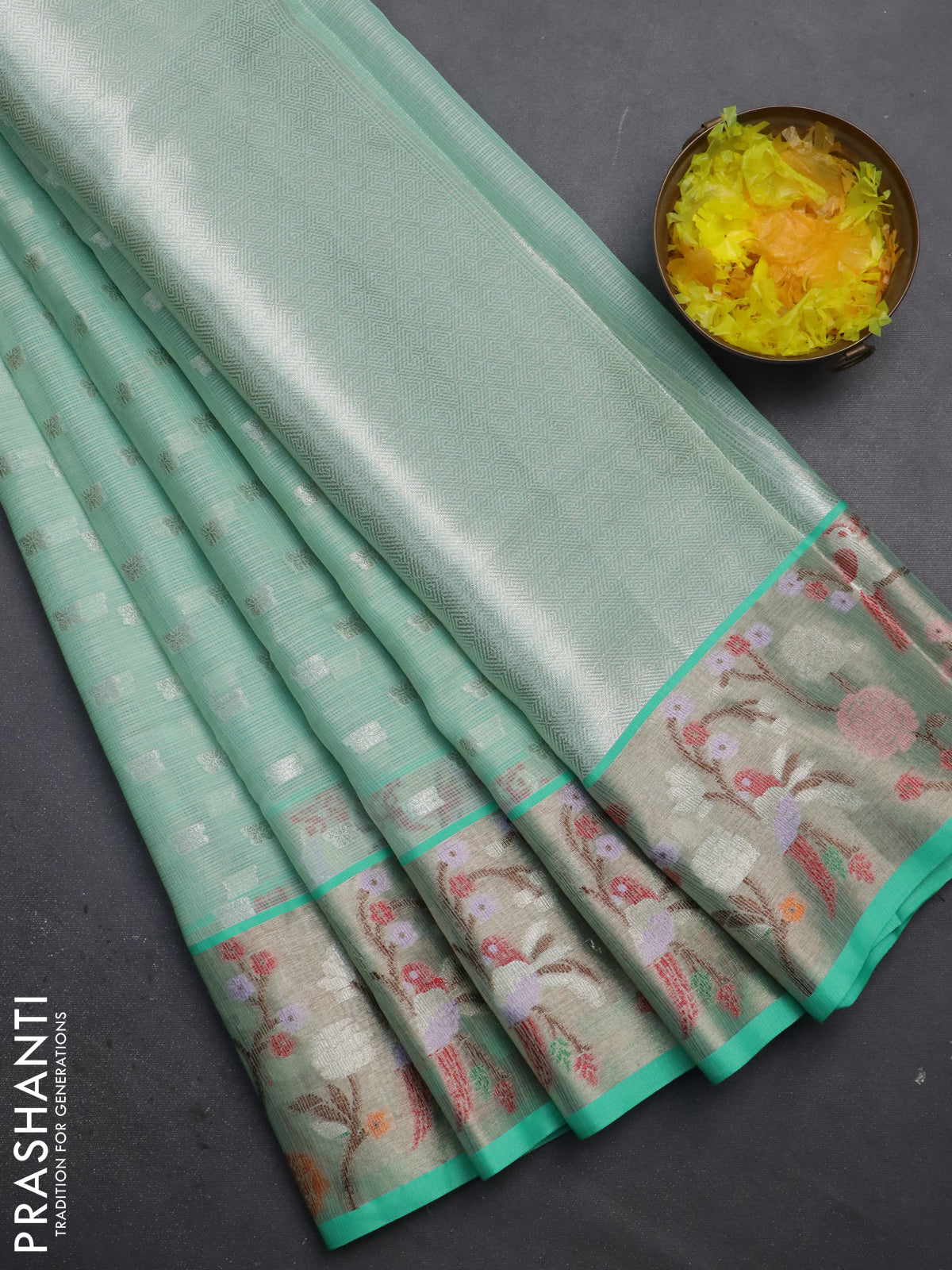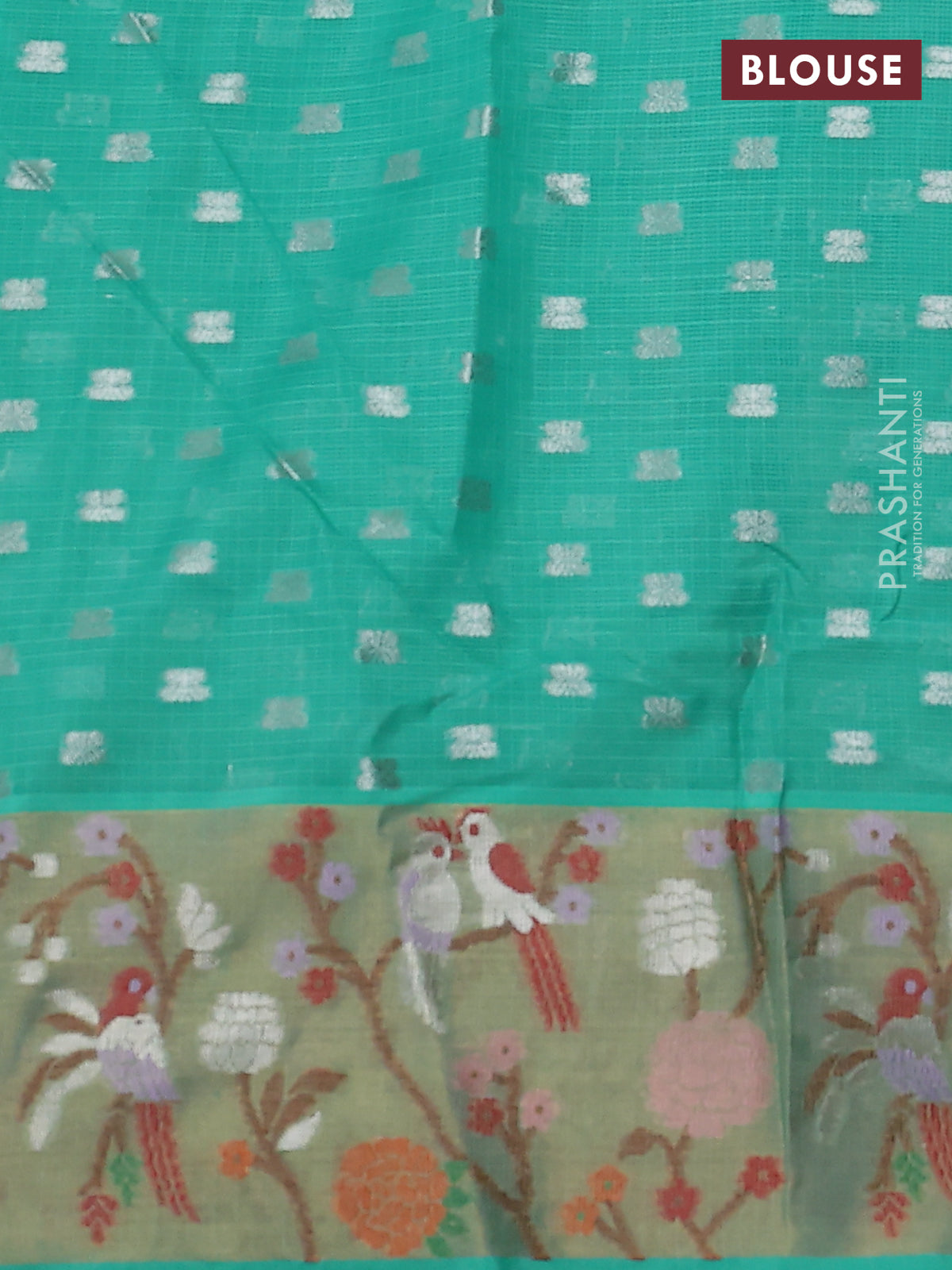 Cotton zari kota saree teal green shade with allover silver zari woven buttas and zari woven paithani border