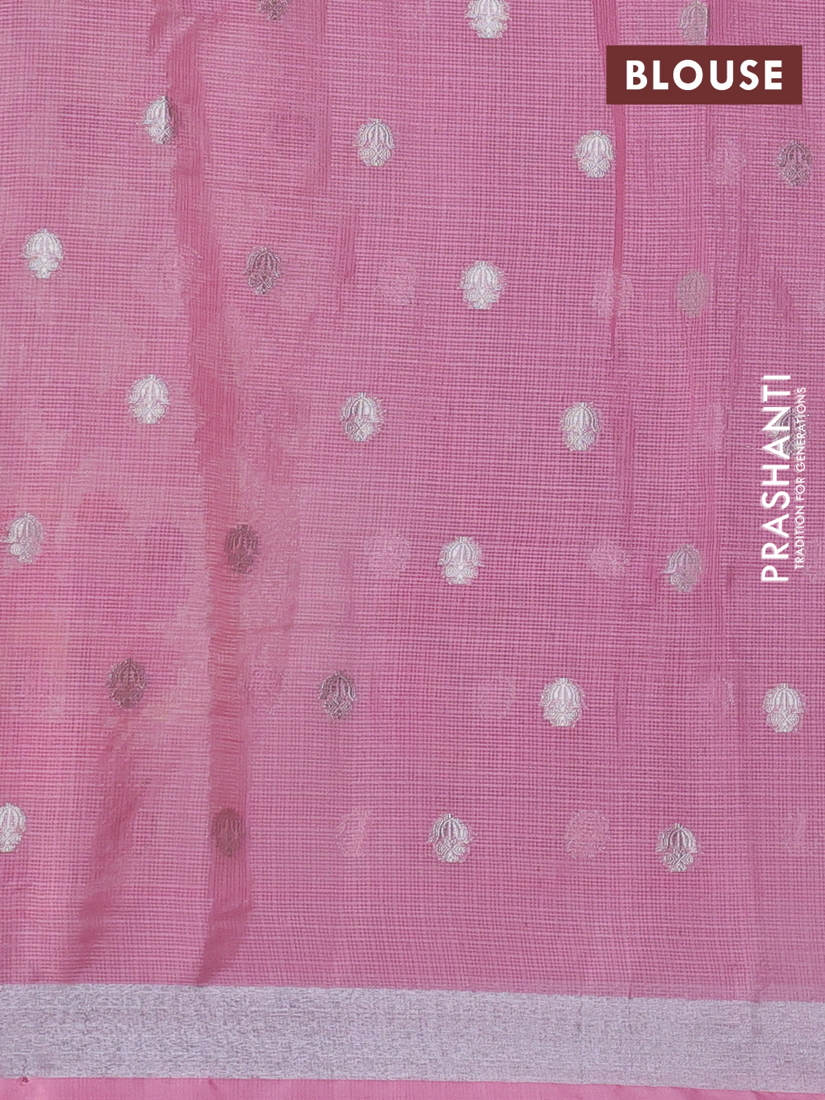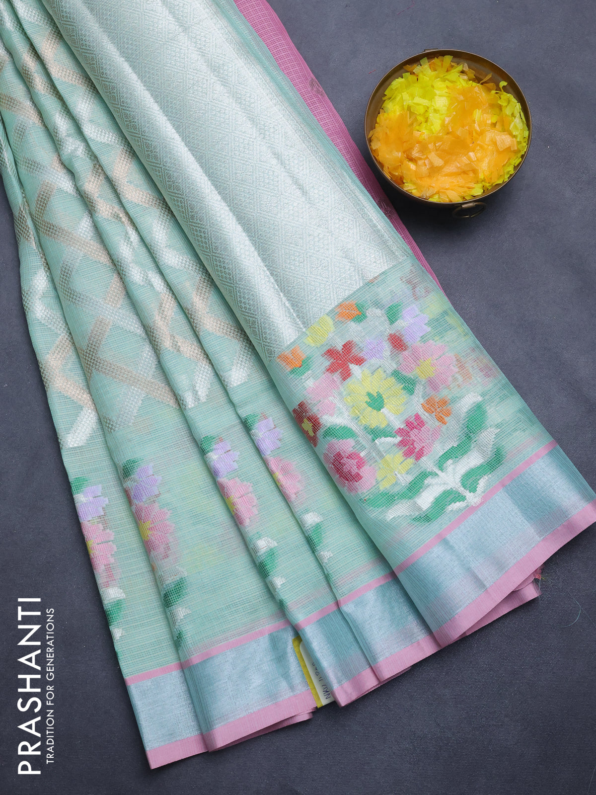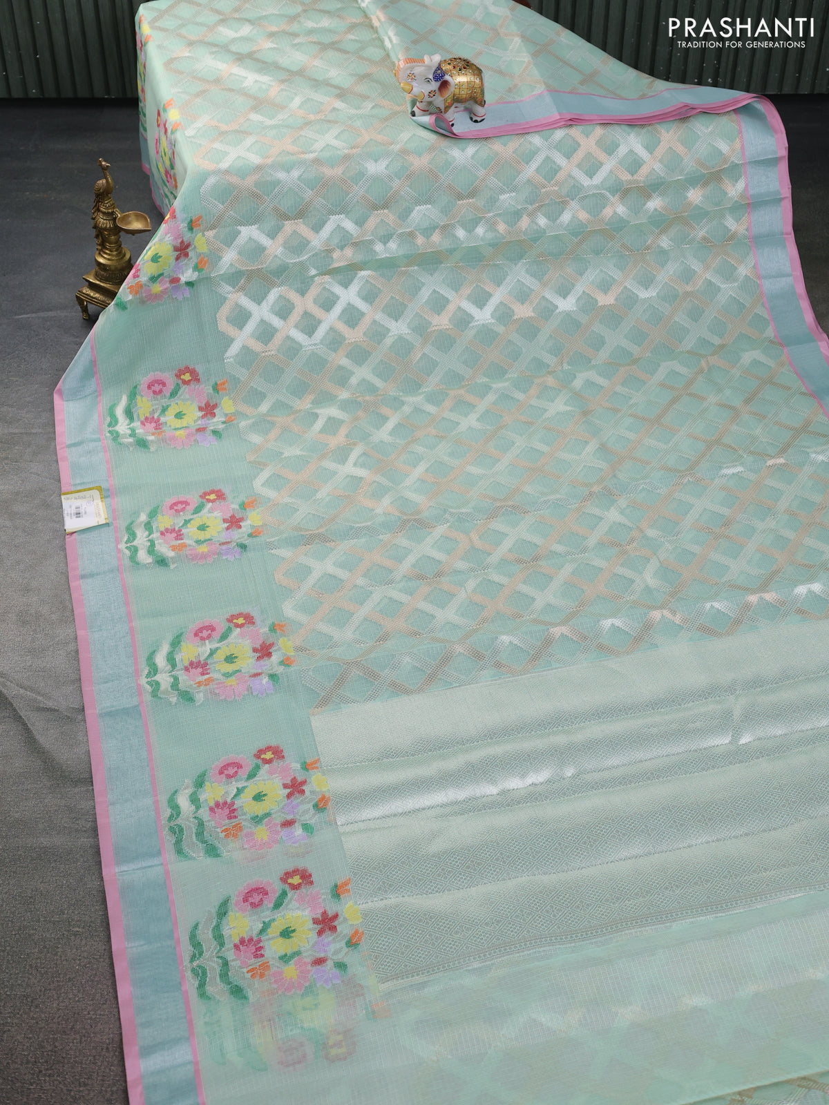 Cotton zari kota saree teal shade and light pink wit allover silver & gold zari weaves and floral butta silver zari woven border