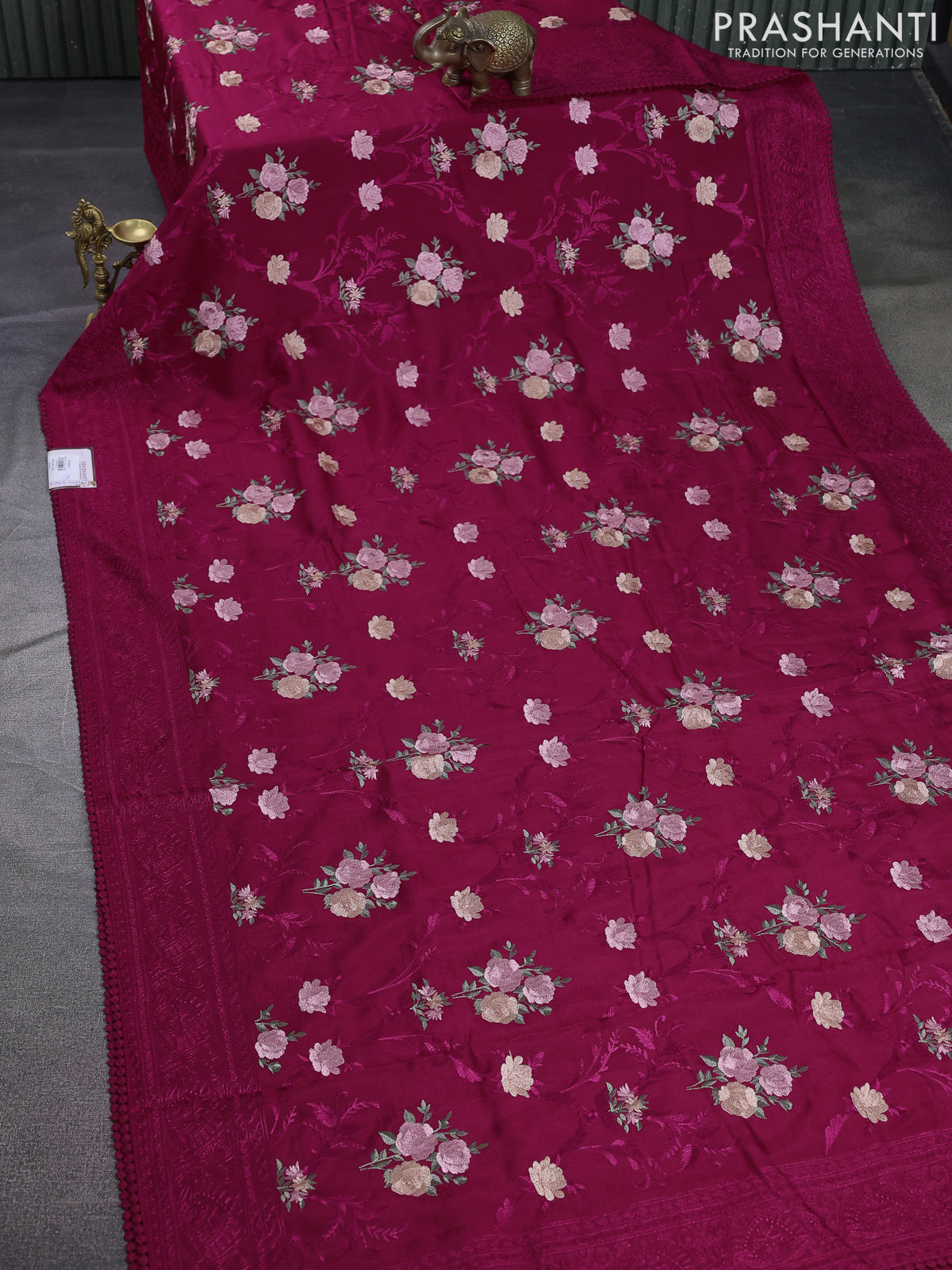 Dola silk saree dark pink with allover floral embroidery work and chikankari work border