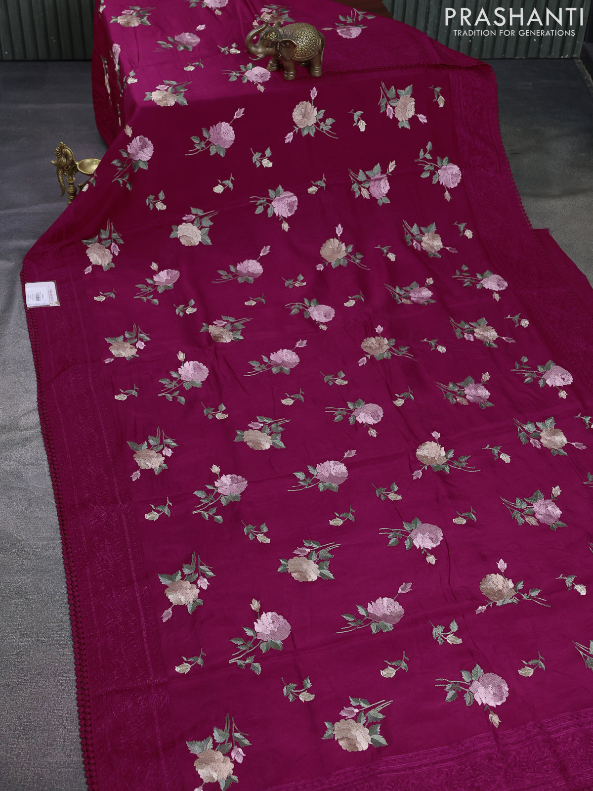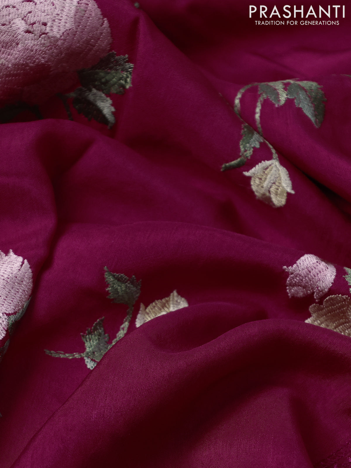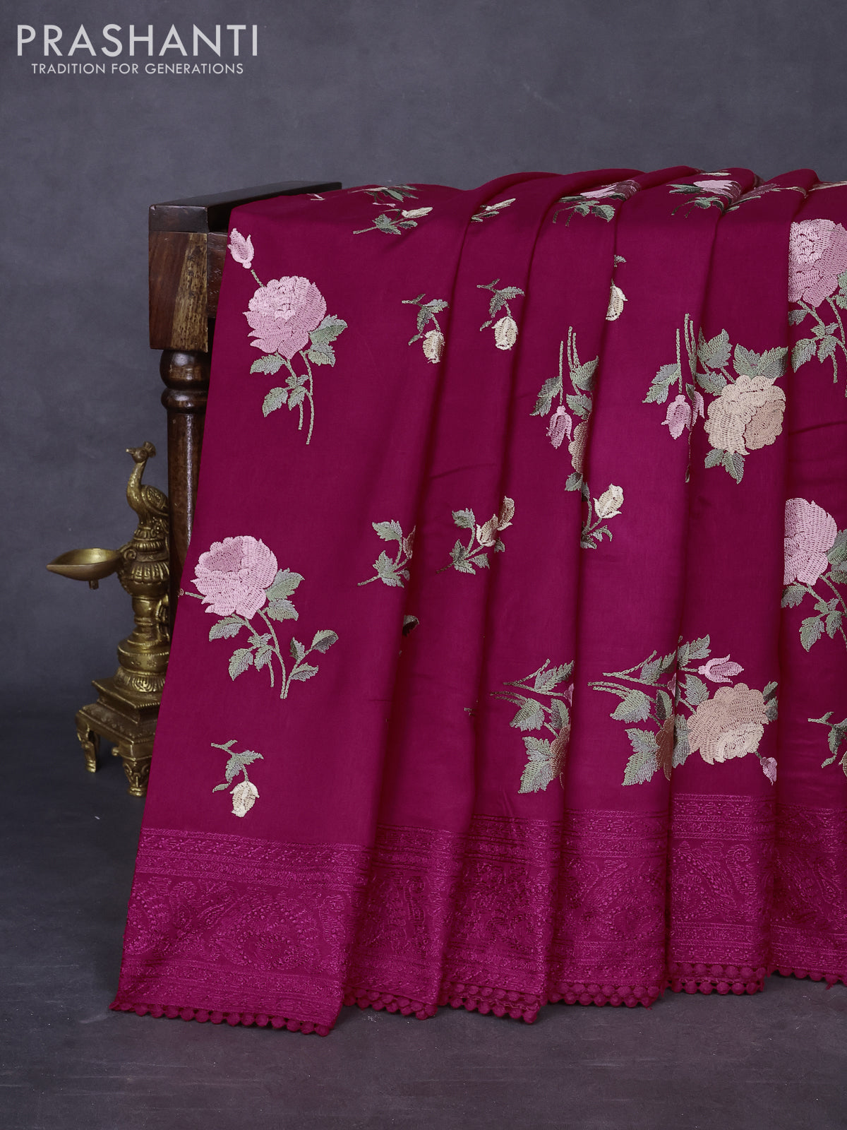 Dola silk saree dark pink with allover floral embroidery work and chikankari work border