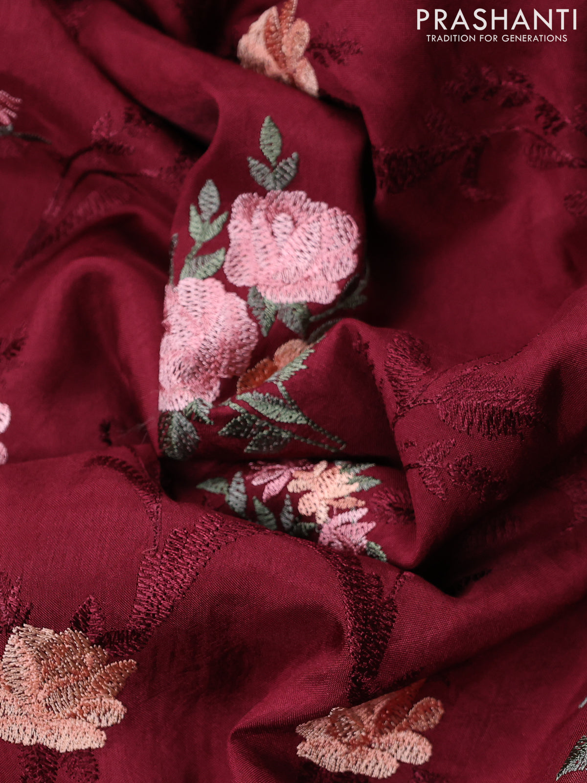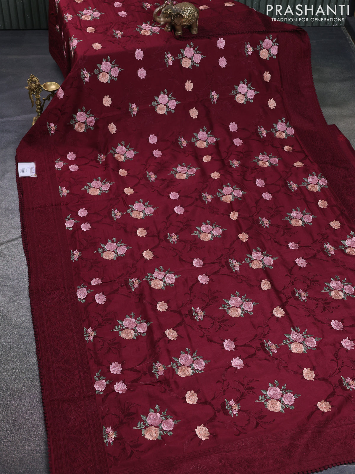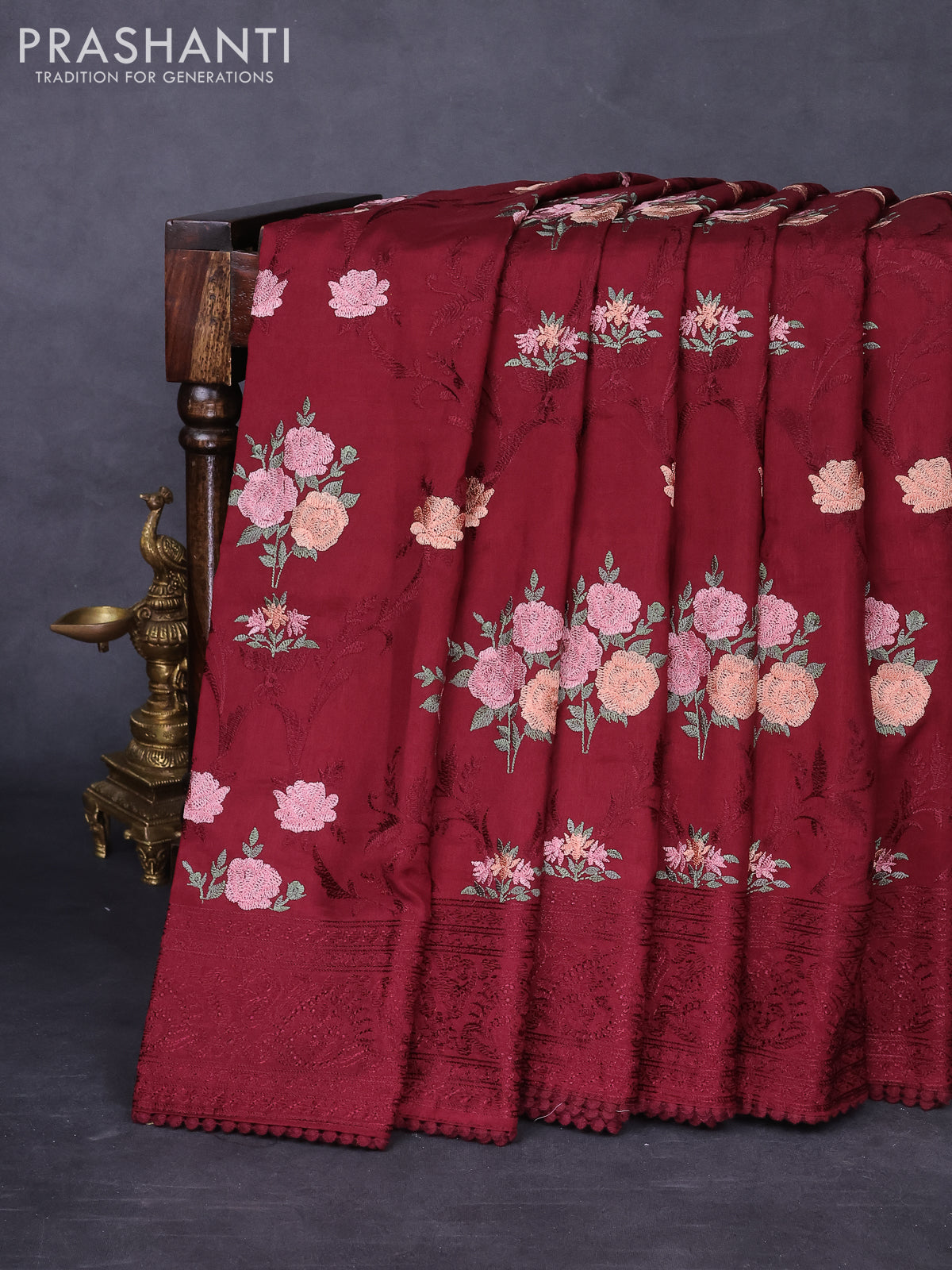 Dola silk saree maroon with allover floral embroidery work and chikankari work border