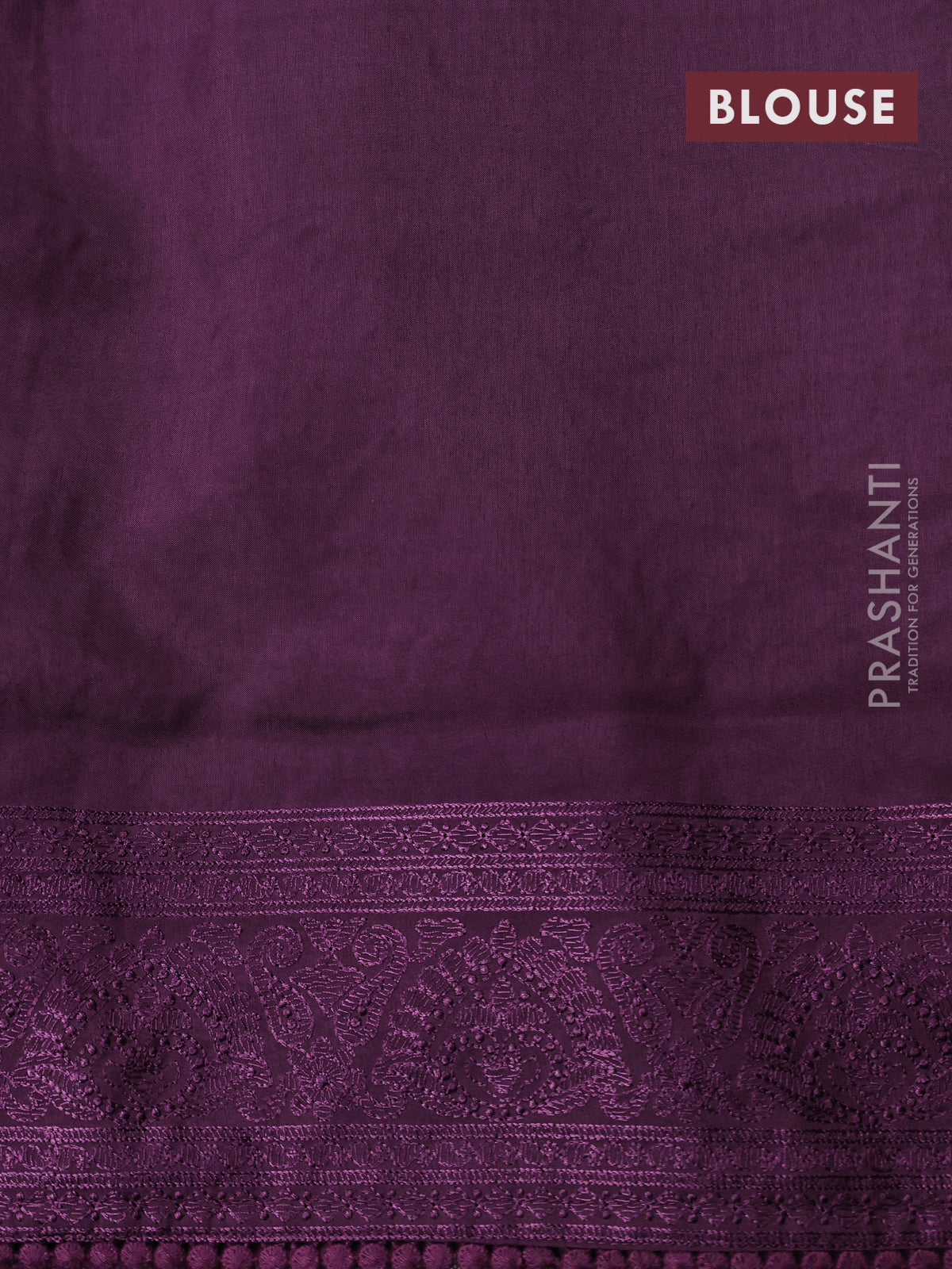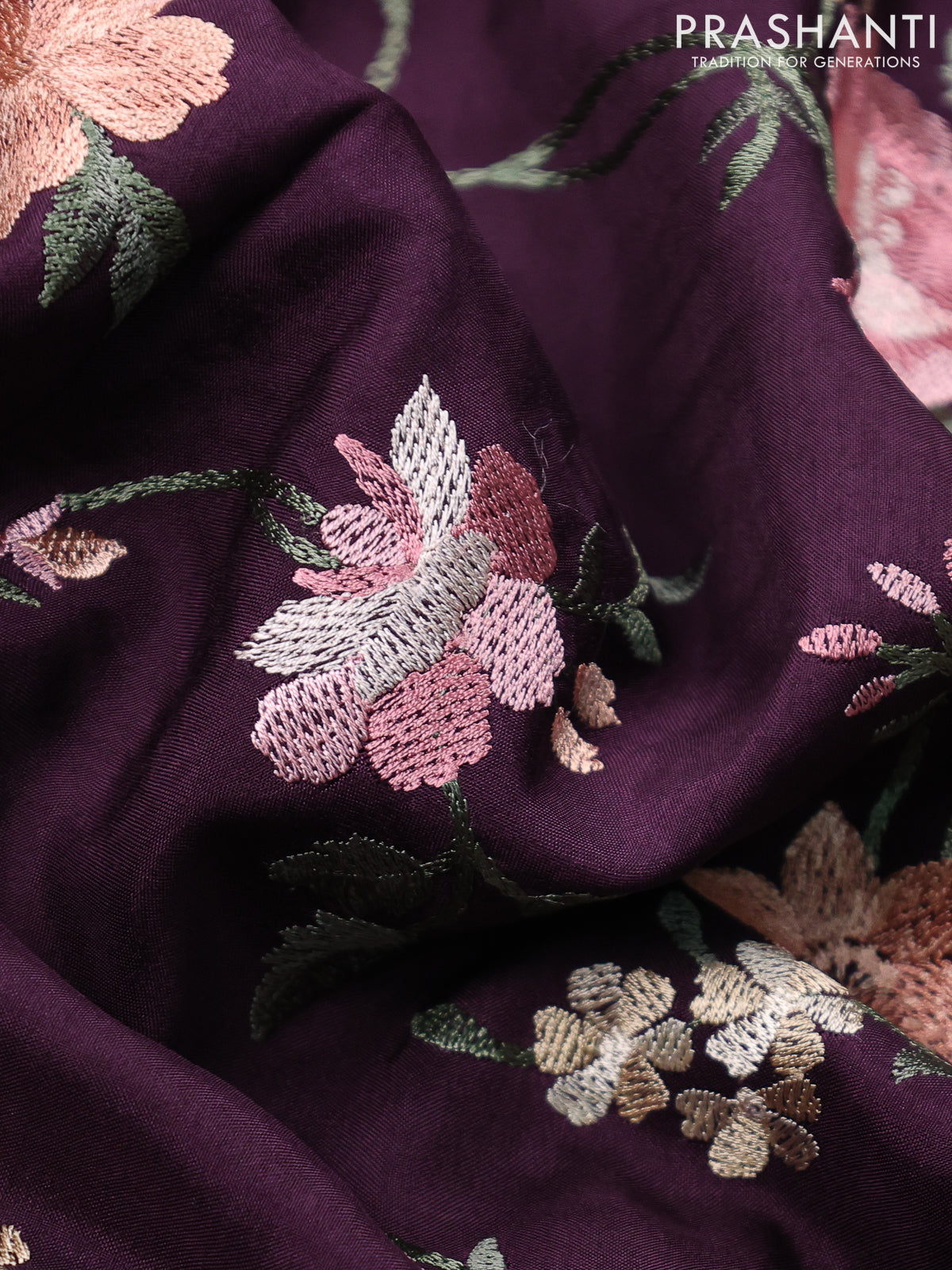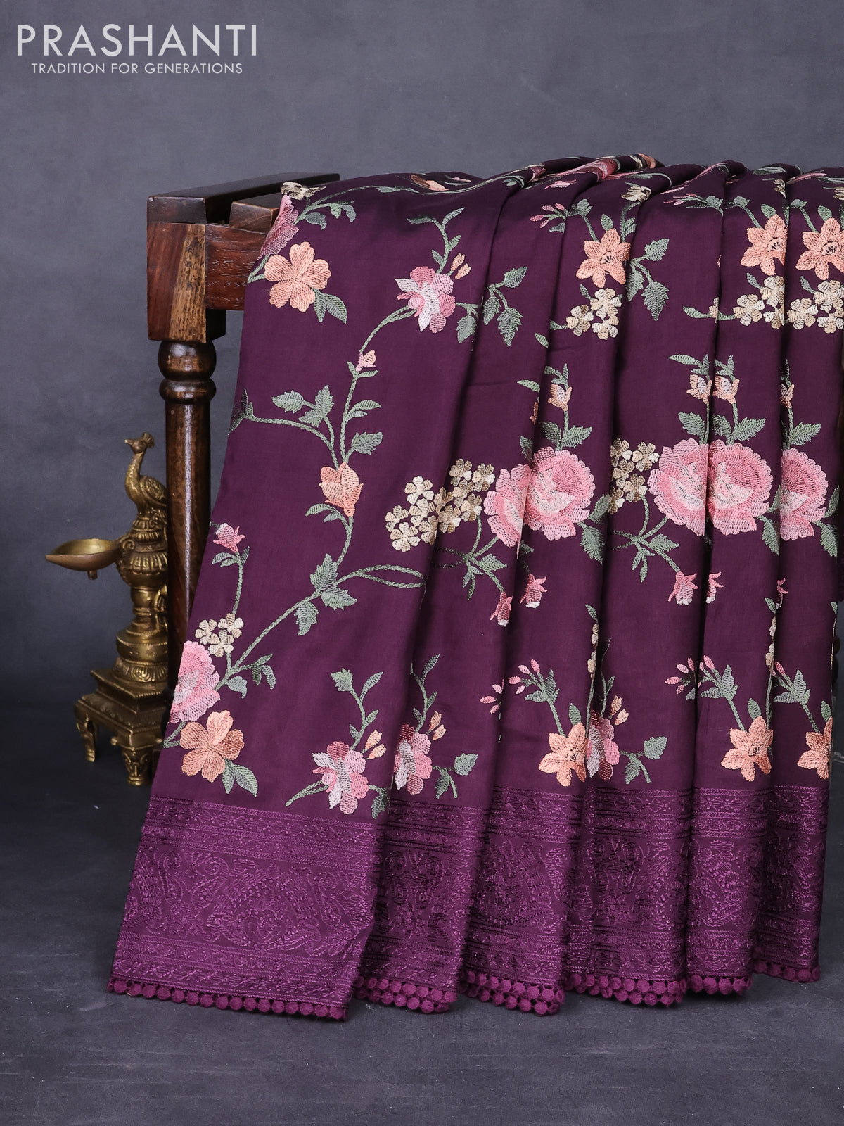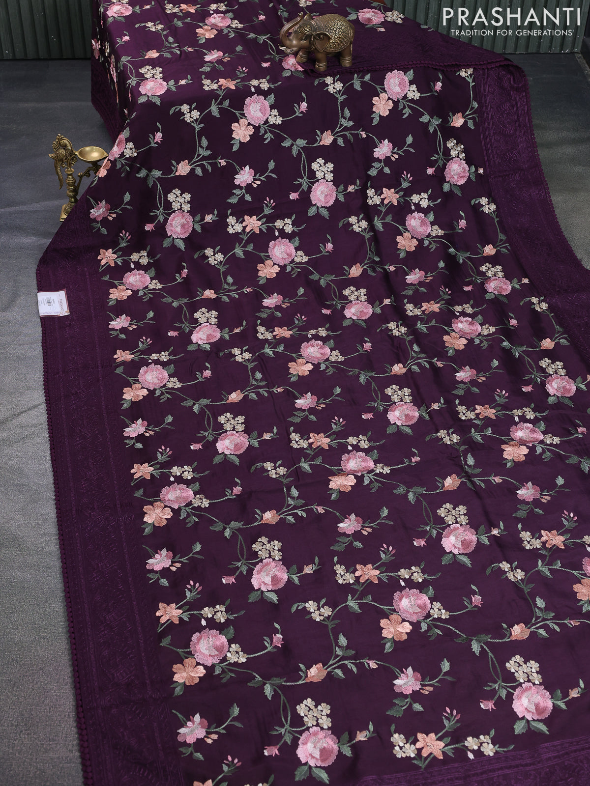 Dola silk saree wine shade with allover floral embroidery work and chikankari work border
