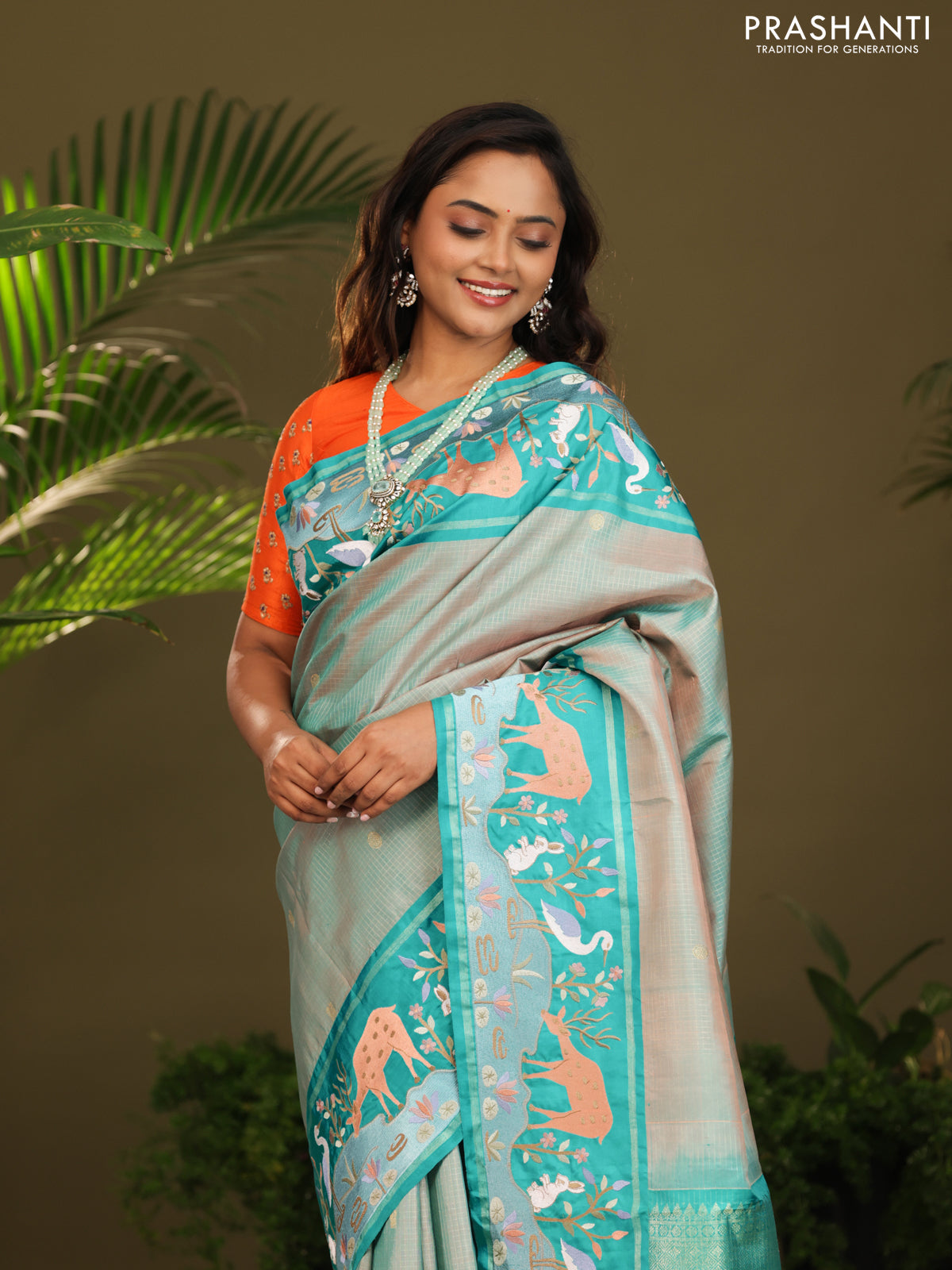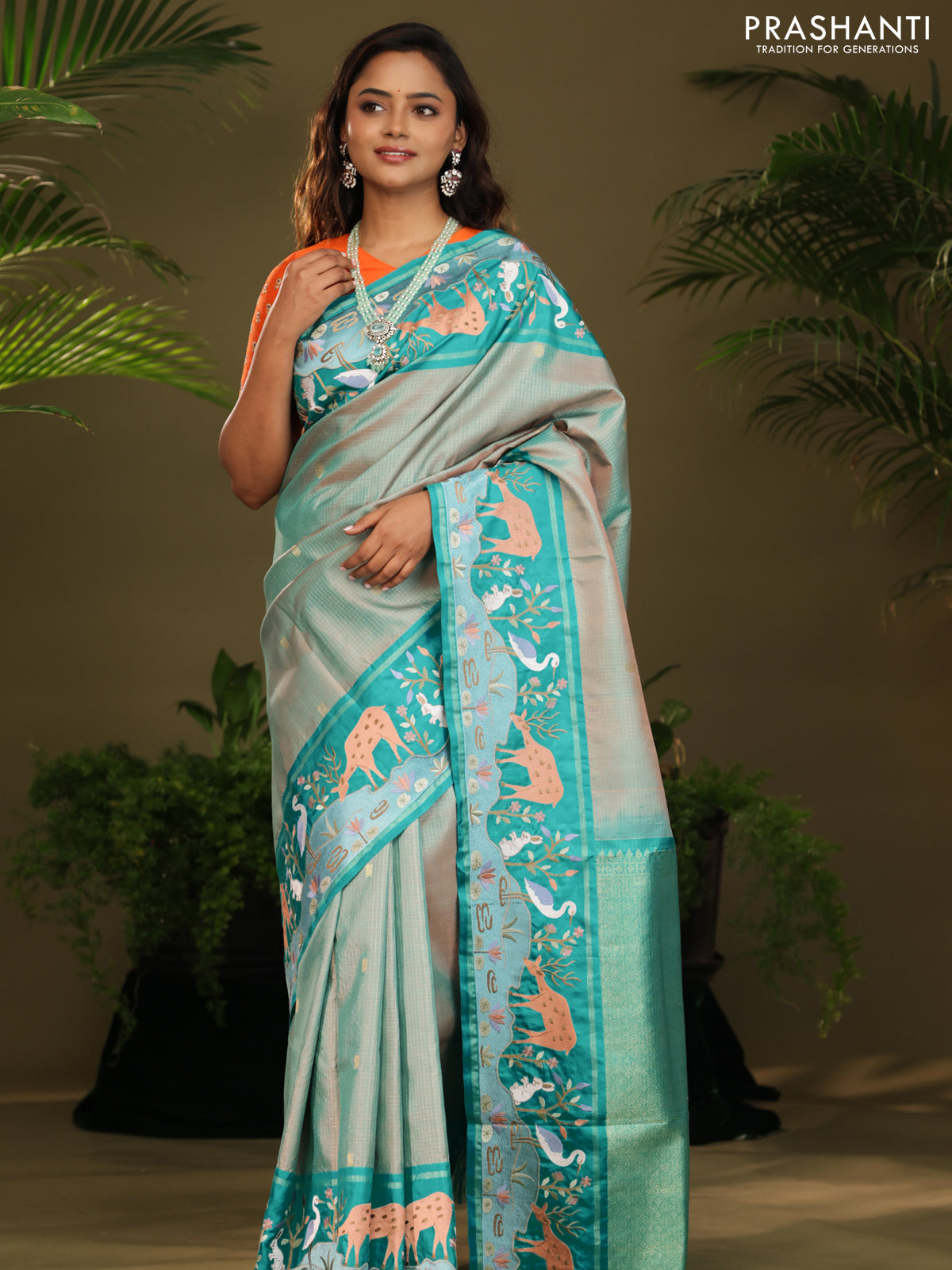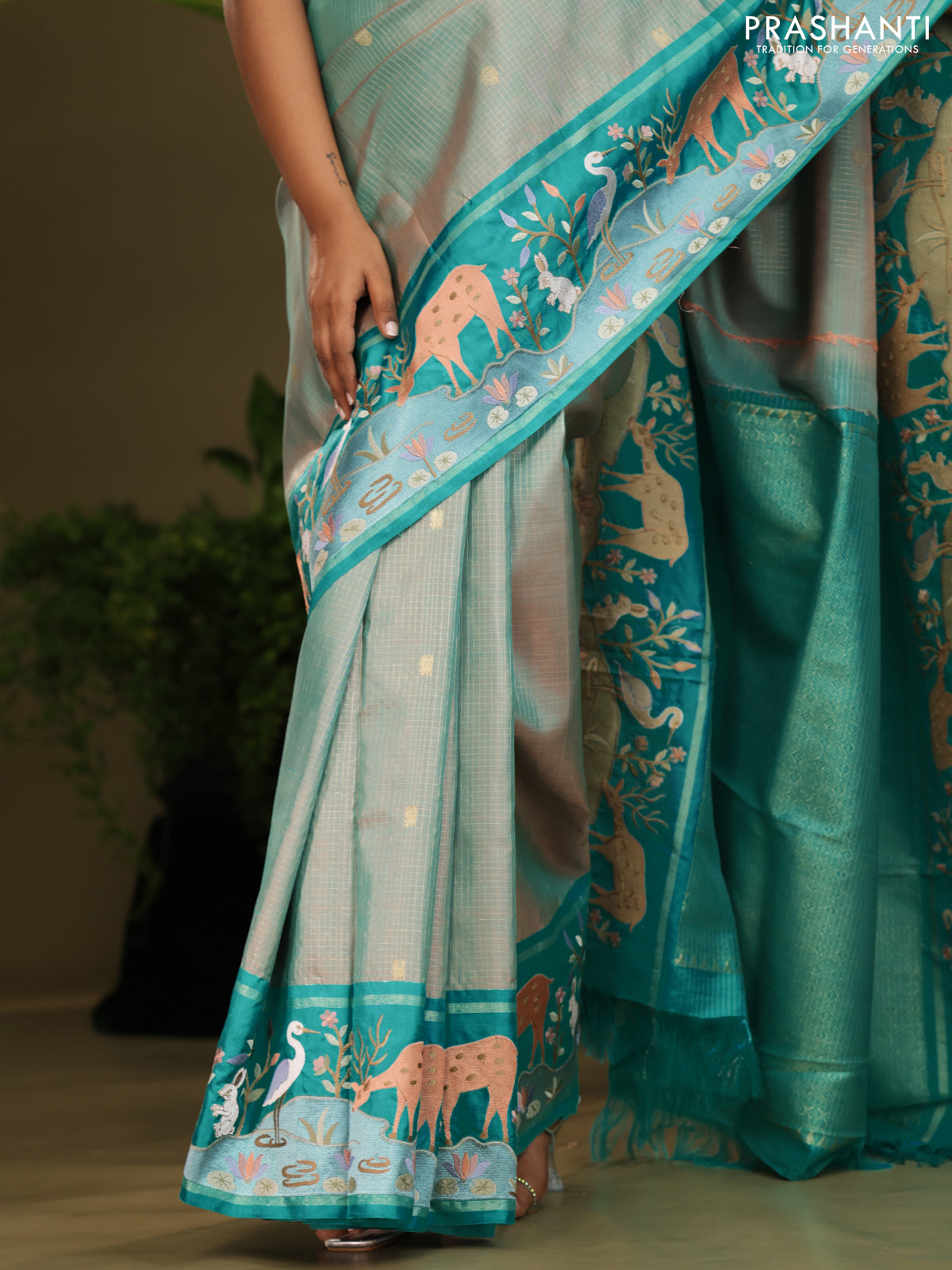 Dual shade of Teal Kanchipuram Silk saree with Border Embroidery