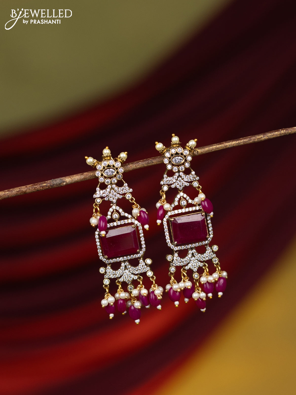 Earring with ruby & cz stones and pearl & pink beads hanging in victorian finish