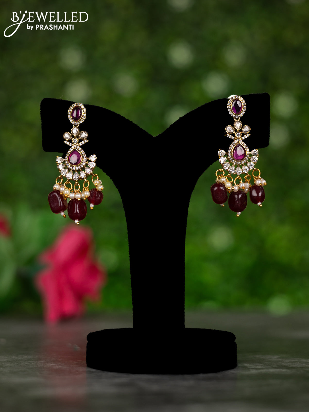 Earrings with ruby & kundan cz stones and pearl & maroon beads hangings in victorian finish