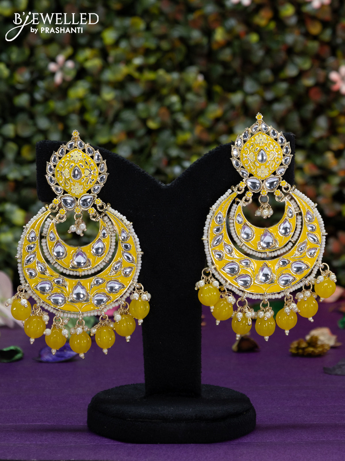Fashion dangler chanbali yellow minakari earrings with kundan stones and beads hangings