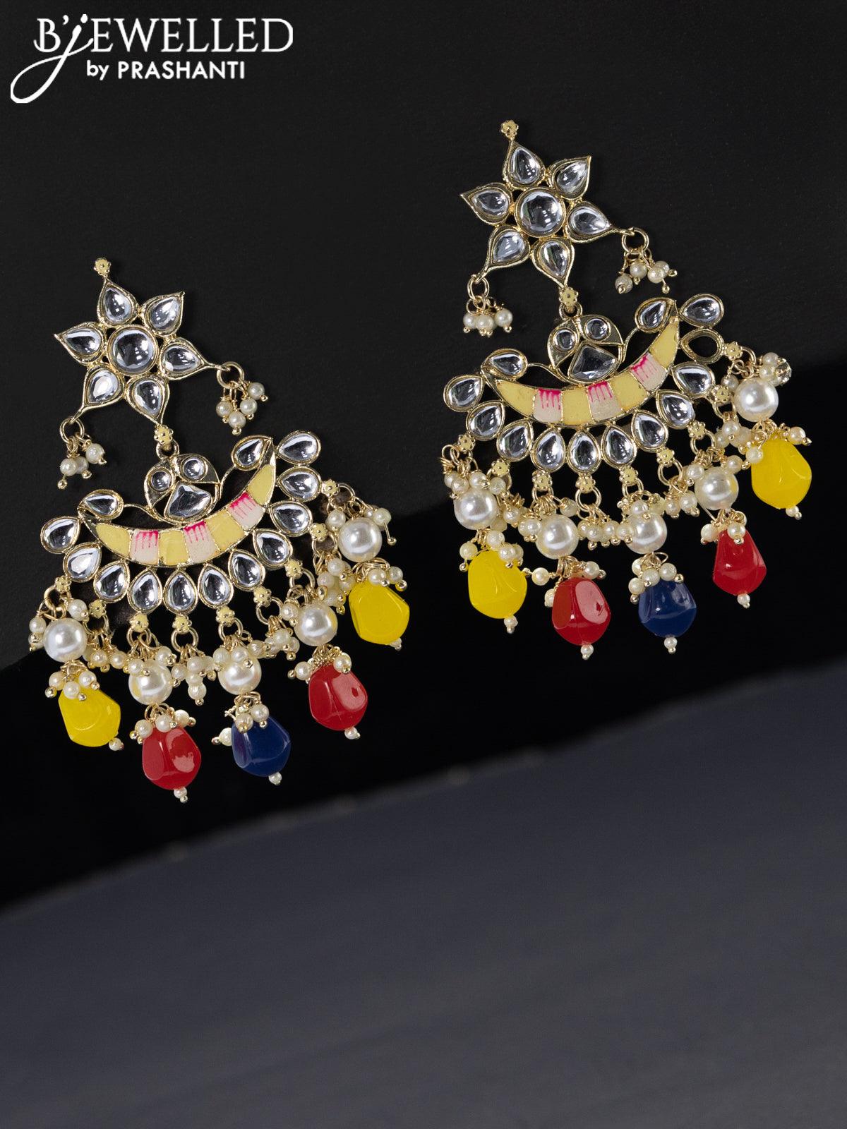 Fashion dangler chandbali cream minakari earrings with kundan stones pearl and beads hangings