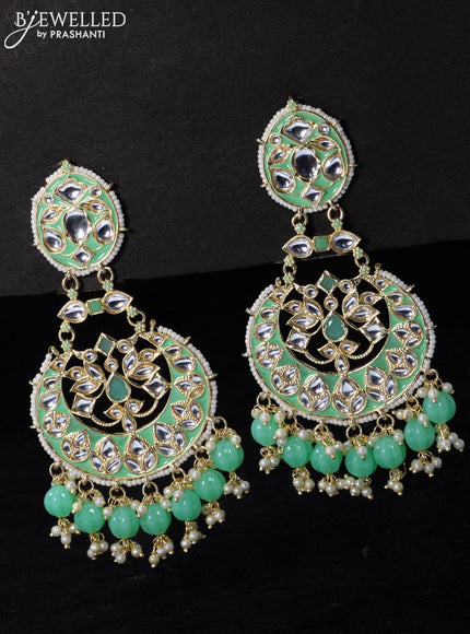 Fashion dangler chandbali earrings teal green with beads and pearl hangings