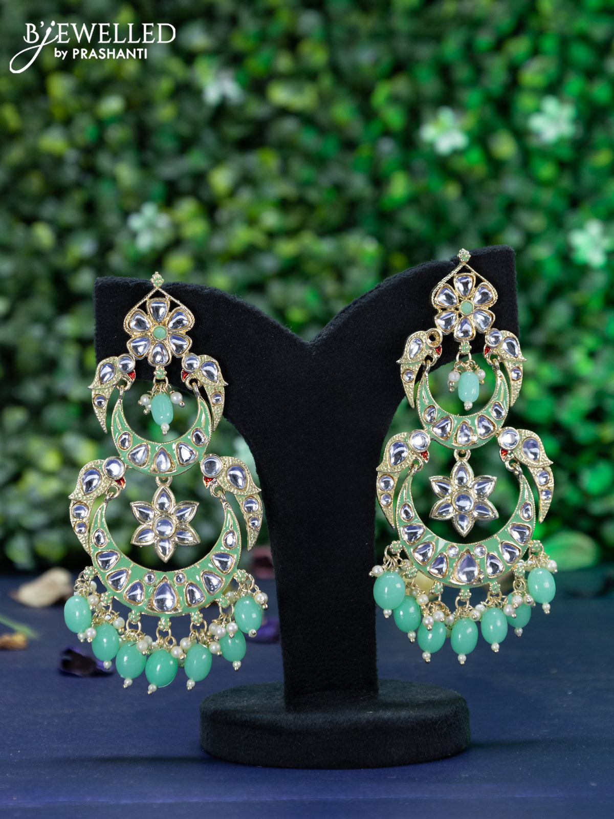 Fashion dangler chandbali teal green minakari earrings with kundan stones and beads hanging