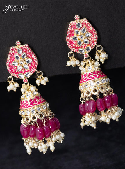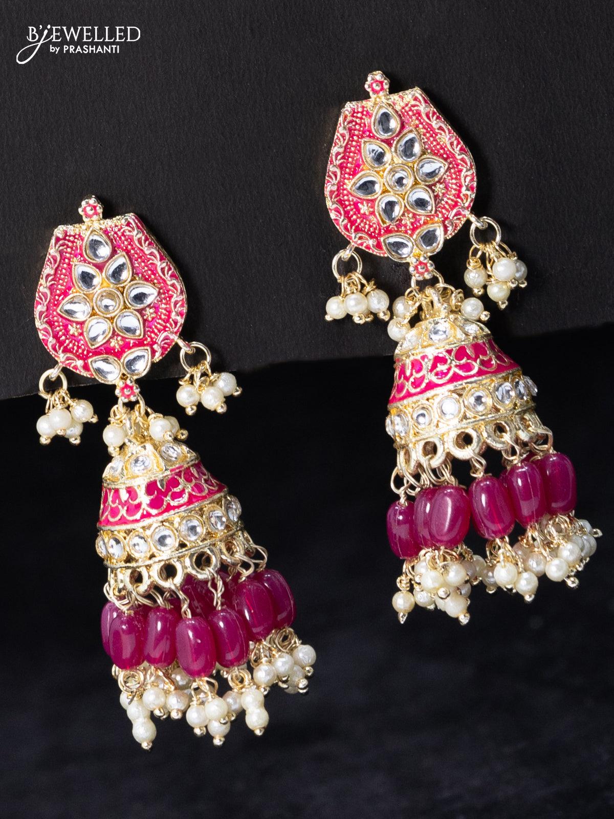 Fashion dangler dark pink jhumka minakari work with beads and pearl hangings