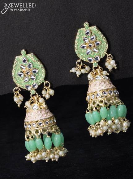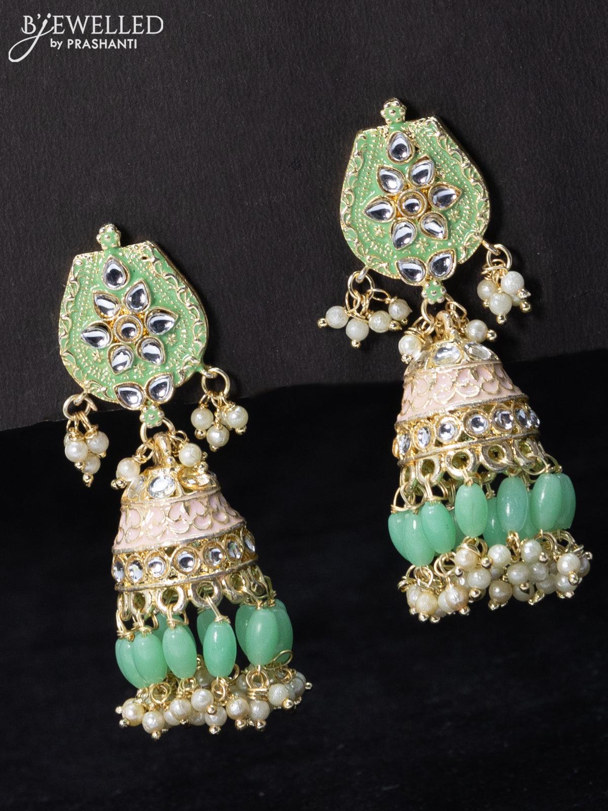 Fashion dangler teal green jhumka minakari work with beads and pearl hangings