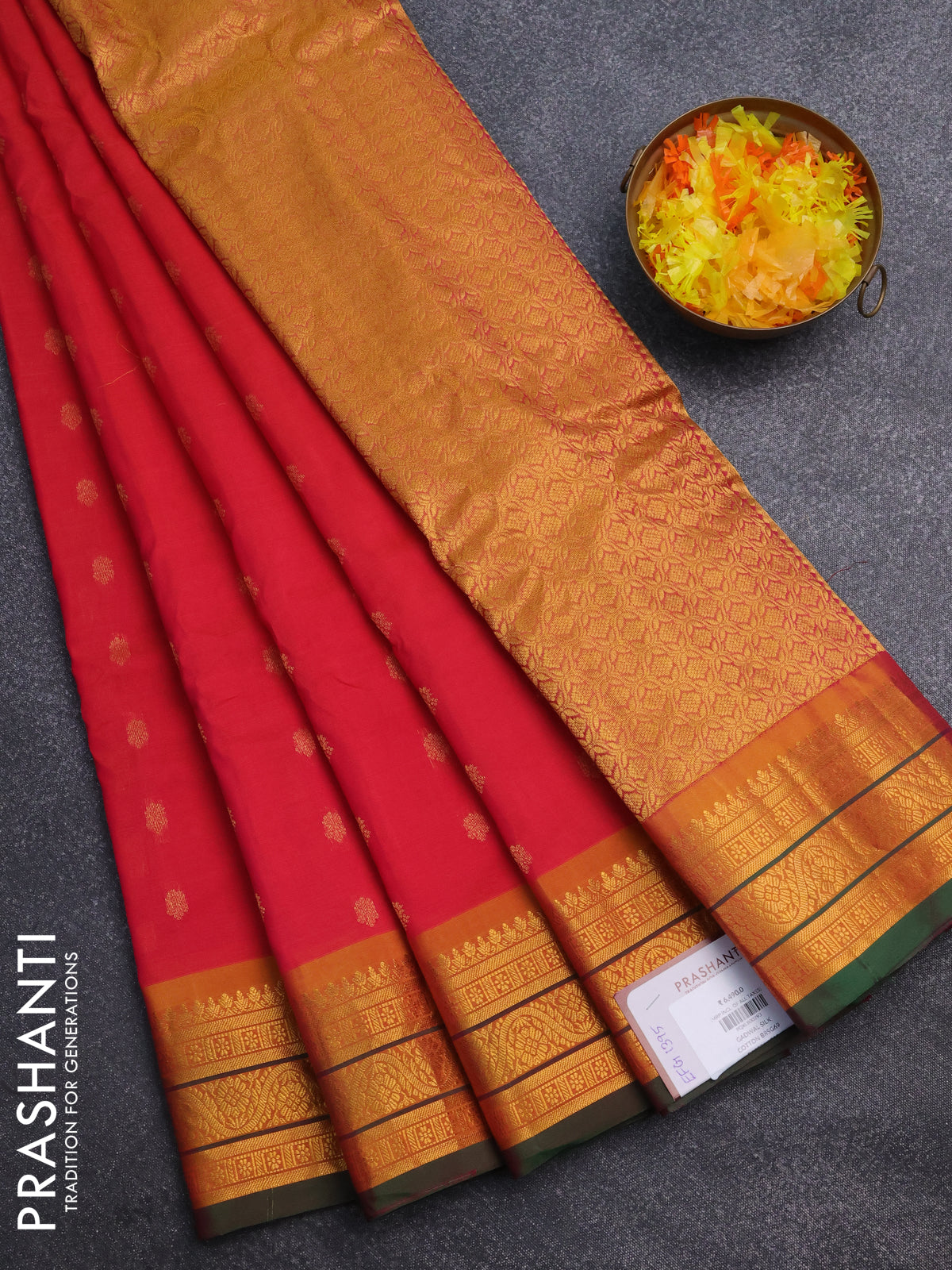 Material : Gadwal Silk Cotton Blouse : Attached Length of saree : 6.2 mts (5.5 mts saree & 70 cms... Read more