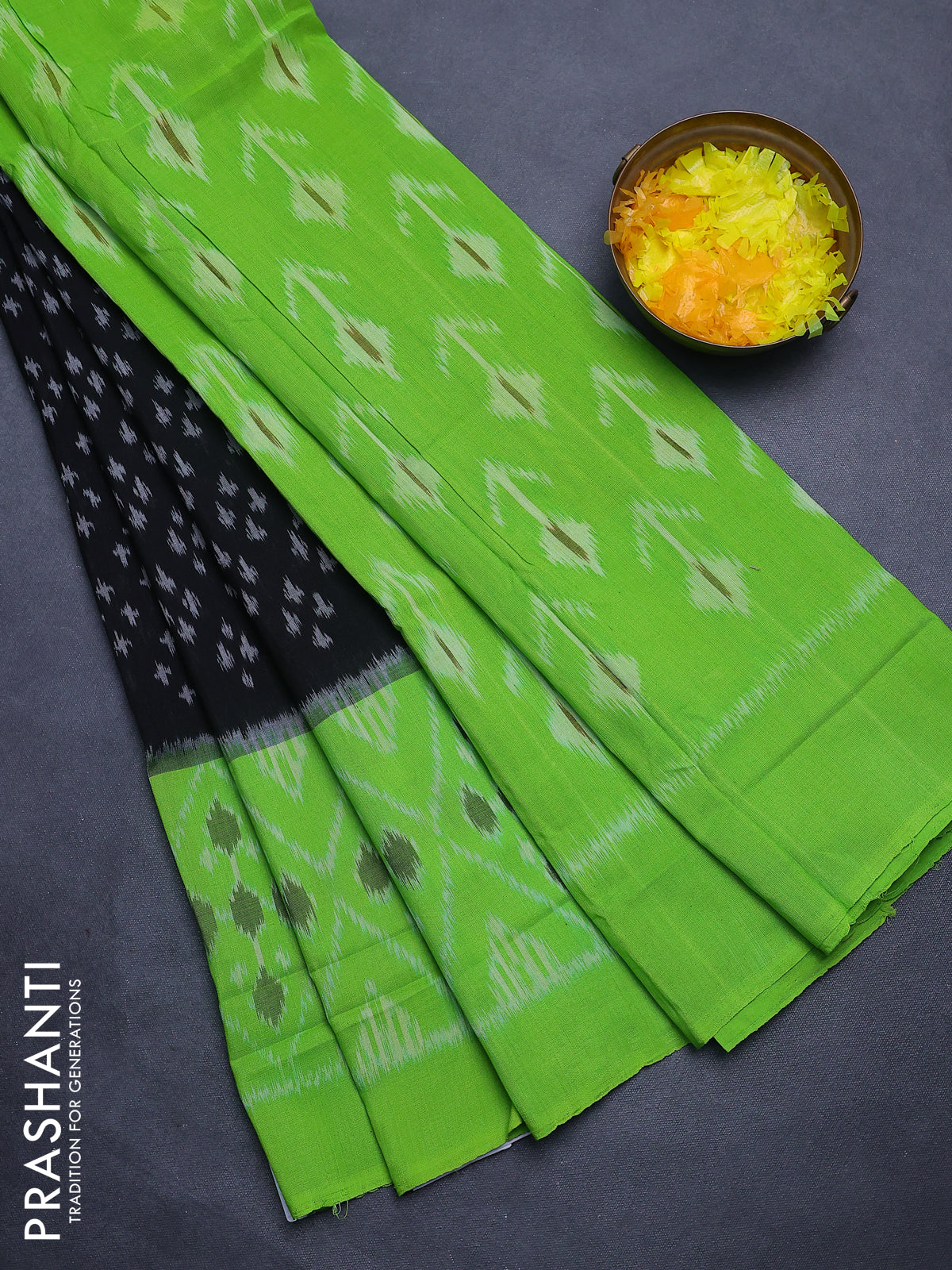 Ikat cotton saree black and light green with allover ikat butta weaves and long ikat woven border