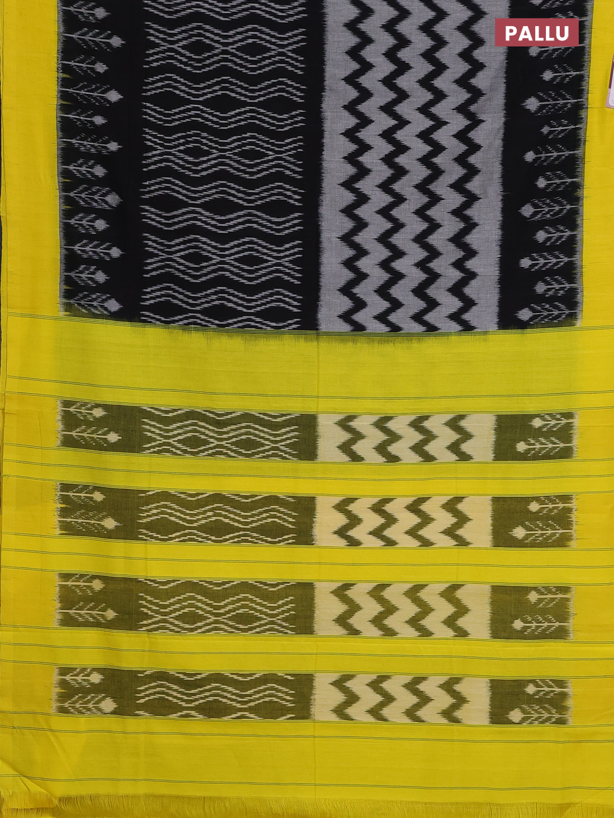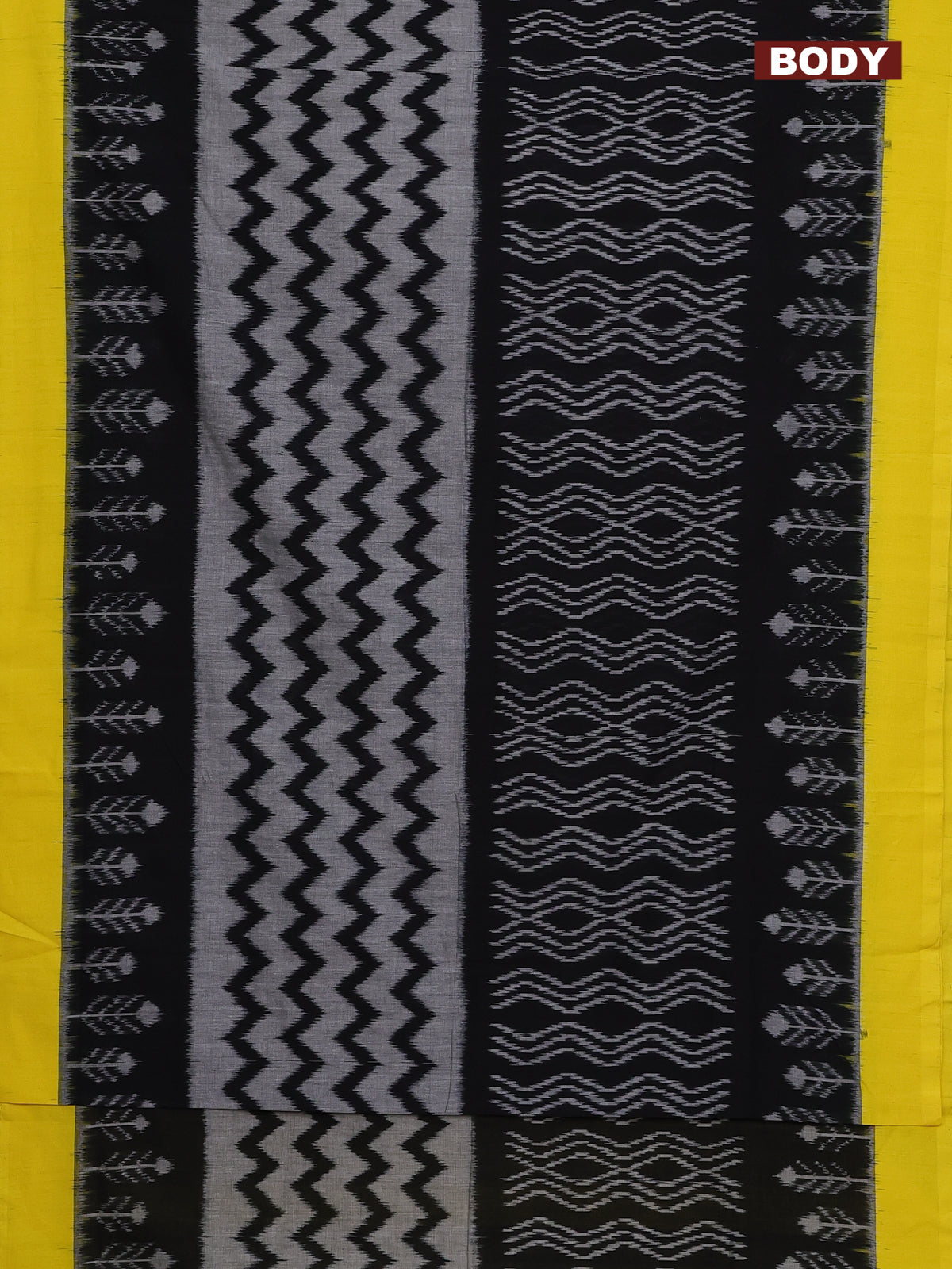 Ikat cotton saree black and yellow with allover zaig zag ikat weaves and simple border