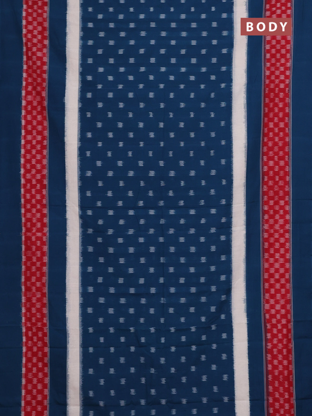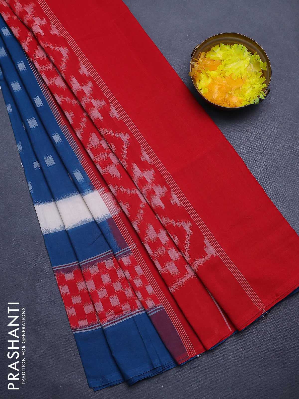 Ikat cotton saree peacock blue and red with allover ikat butta weaves and long long simple border