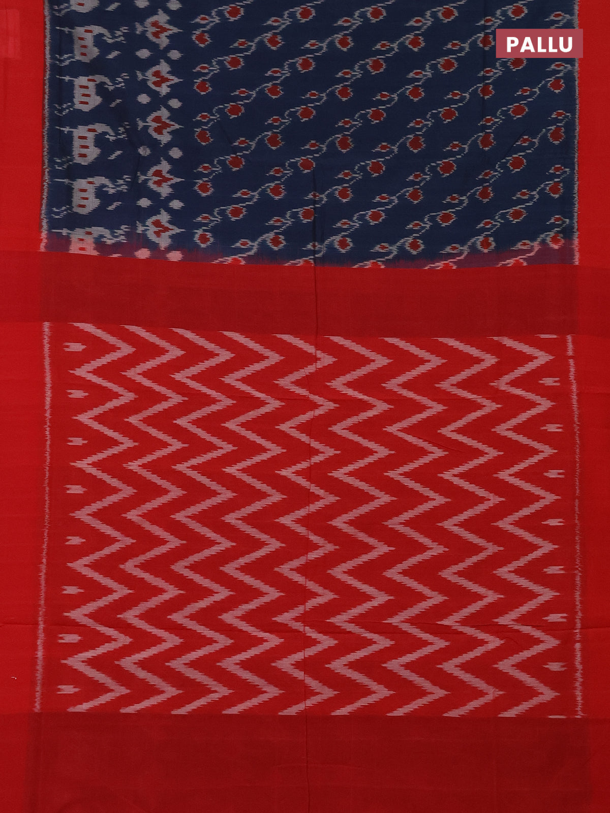 Ikat cotton saree peacock blue and red with allover ikat weaves and simple border