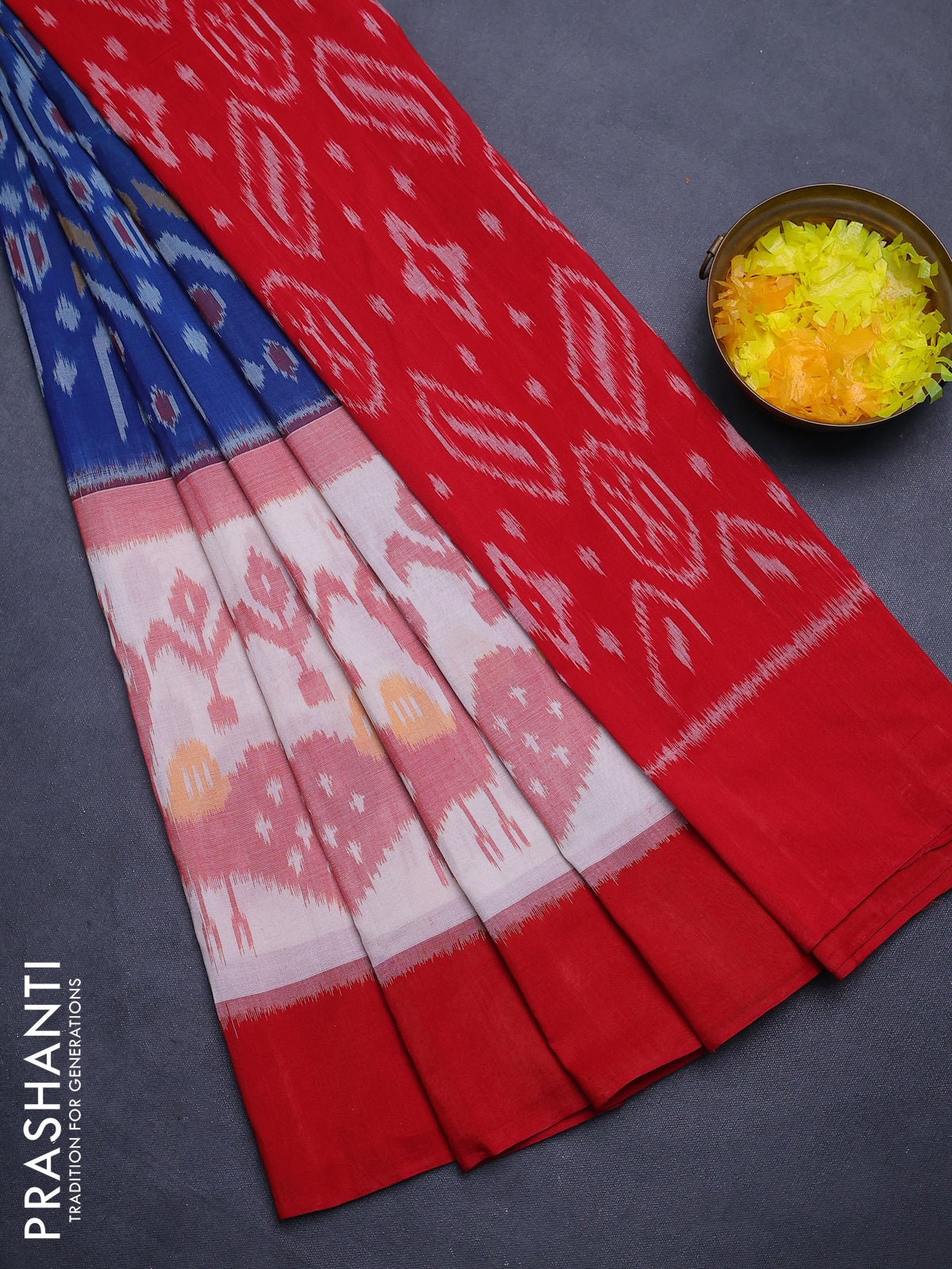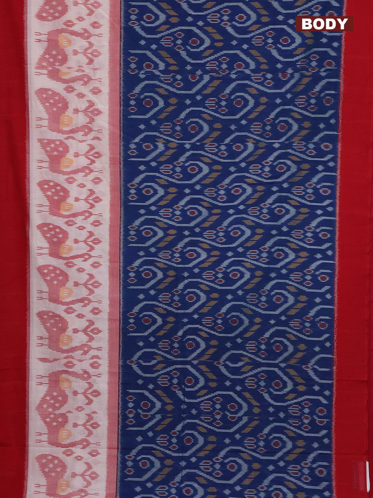 Ikat cotton saree peacock blue and red with allover ikat weaves and simple border
