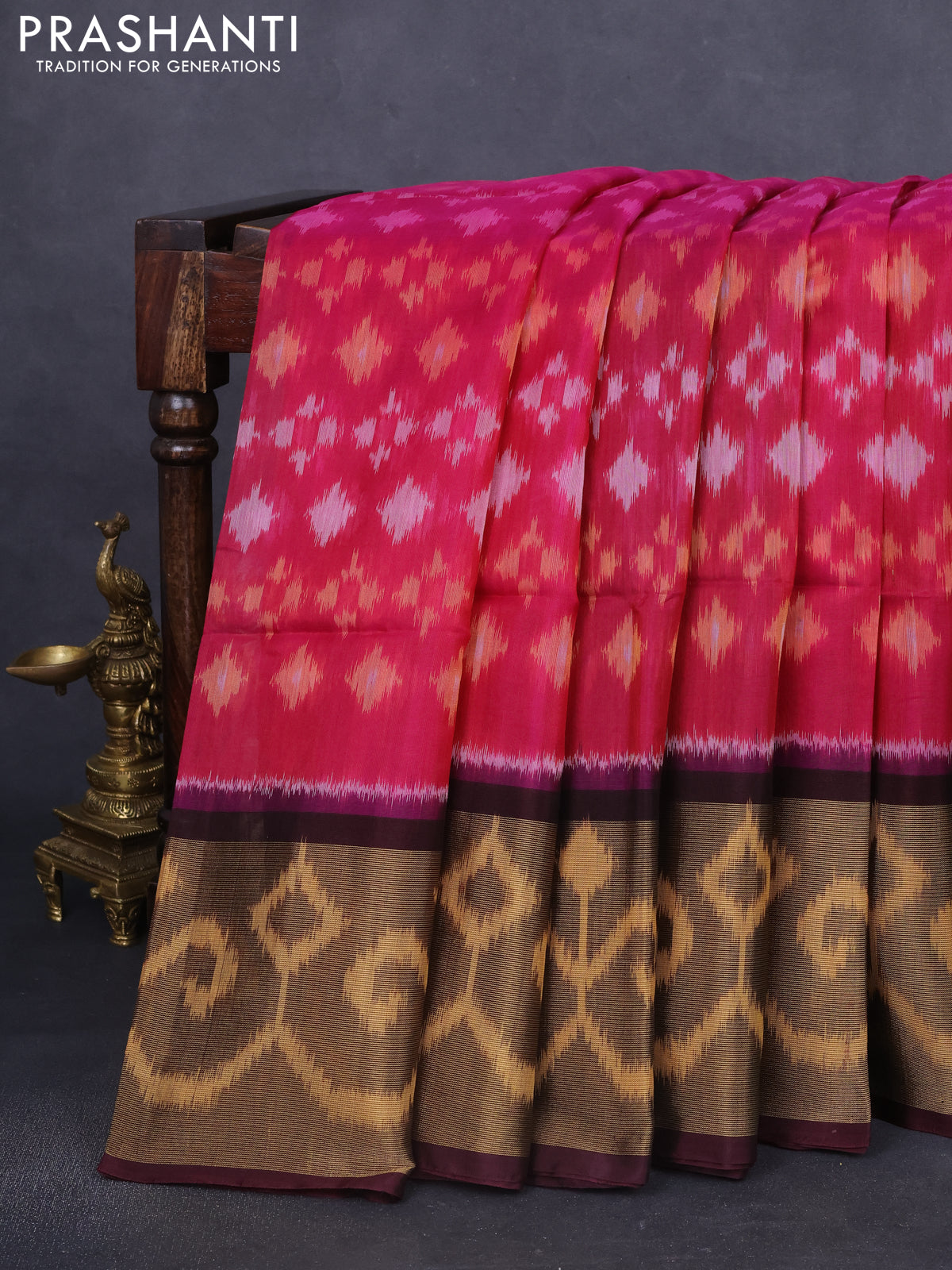 Ikat silk cotton saree coffee brown and pink with allover ikat weaves and long zari woven ikat border