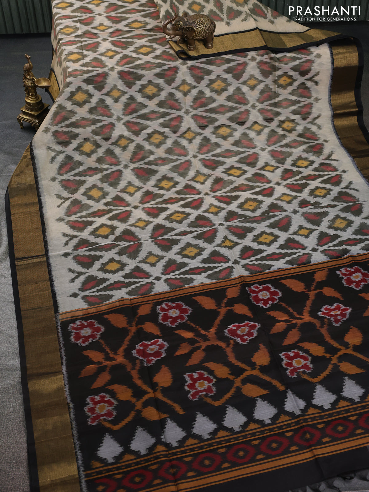 Ikat silk cotton saree cream and black with allover ikat weaves and zari woven border