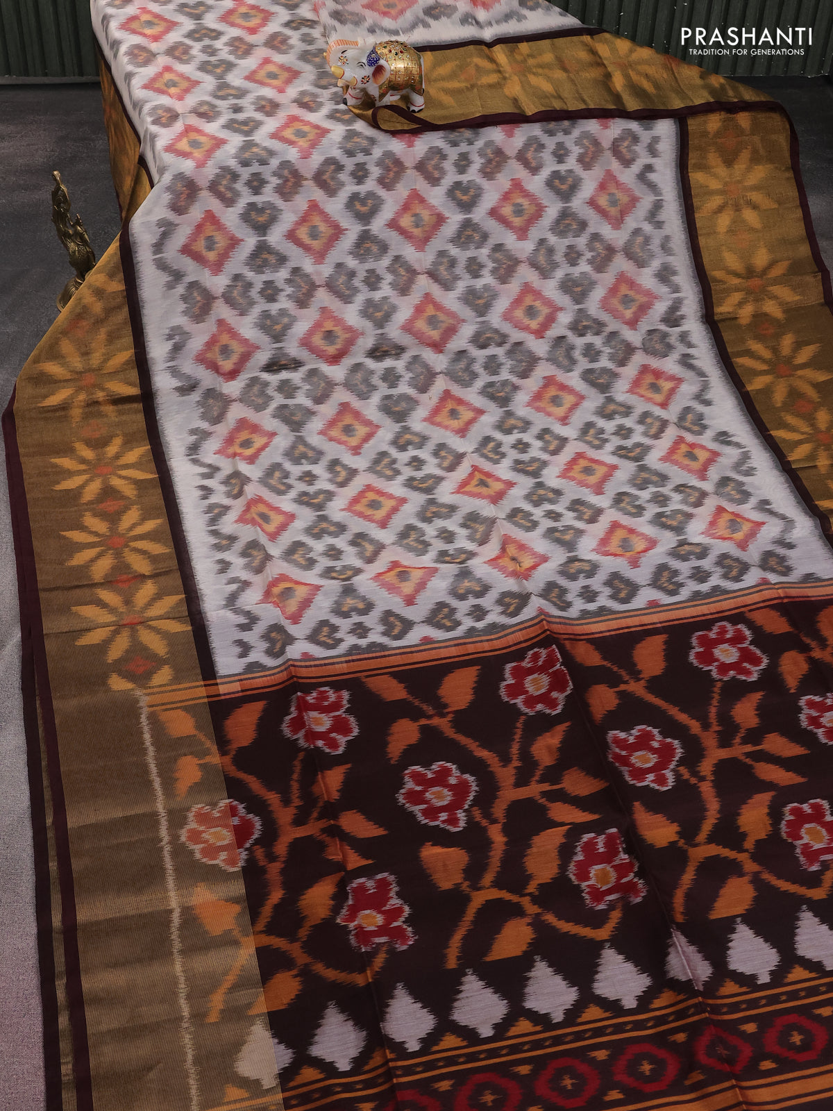 Ikat silk cotton saree cream and coffee brown with allover ikat weaves and long zari woven ikat border