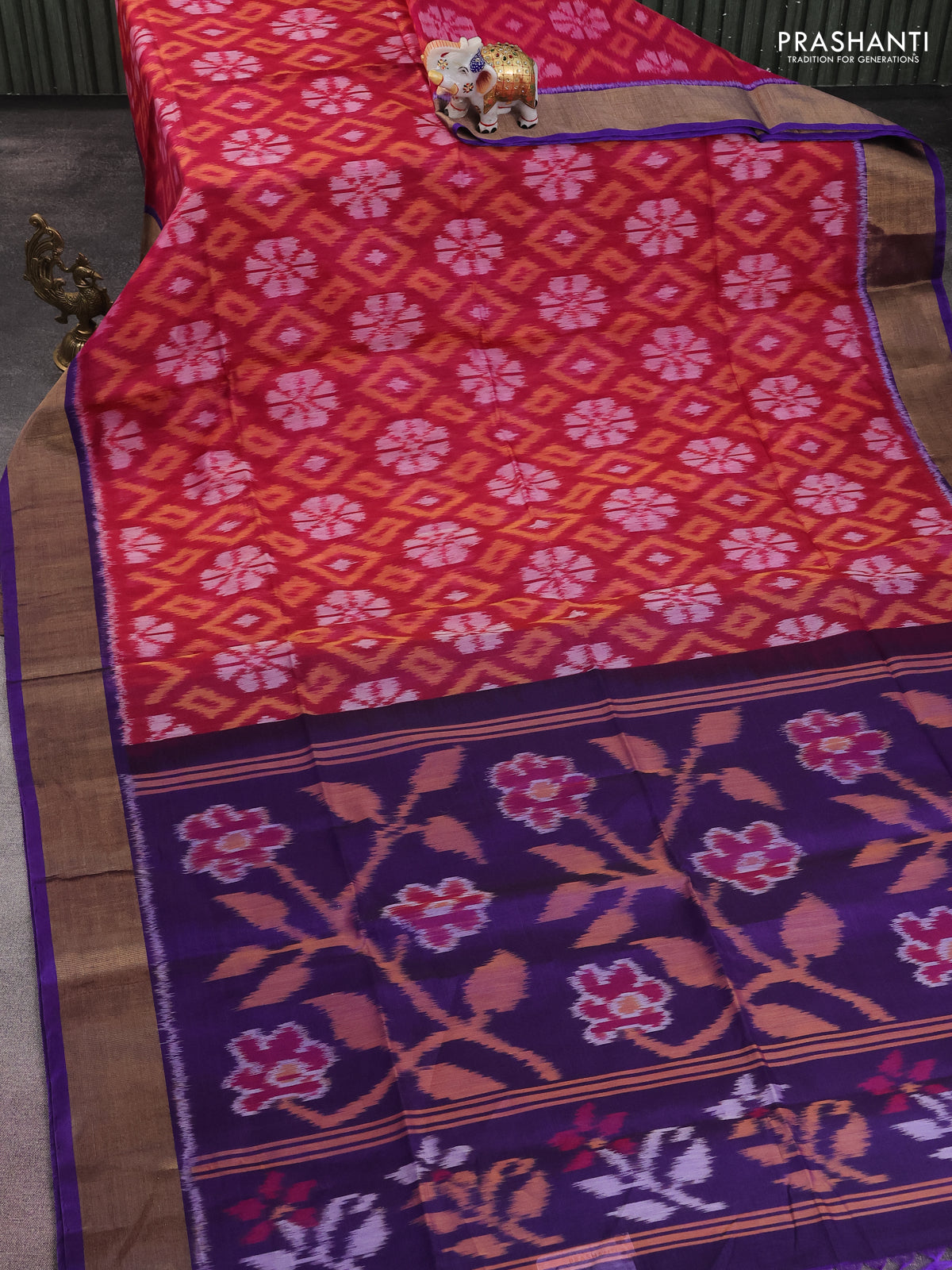 Ikat silk cotton saree dark pink and violet with allover ikat weaves and zari woven border