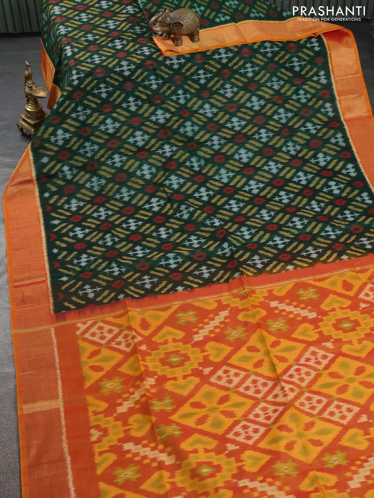 Ikat silk cotton saree green and dual shade of mustard with allover ikat weaves and zari woven border
