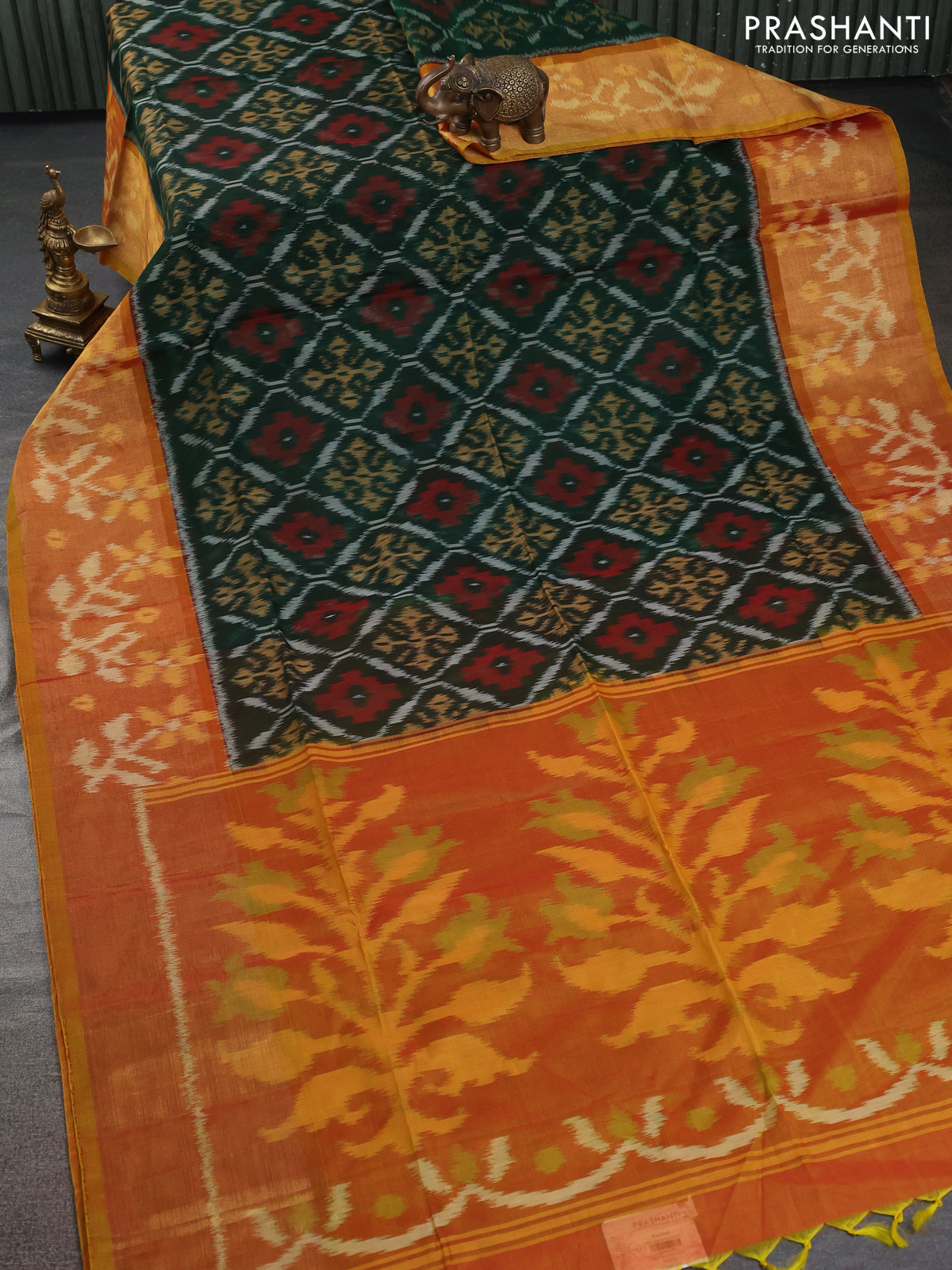 Ikat silk cotton saree green and mustard yellow with allover ikat weaves and ikat woven zari border