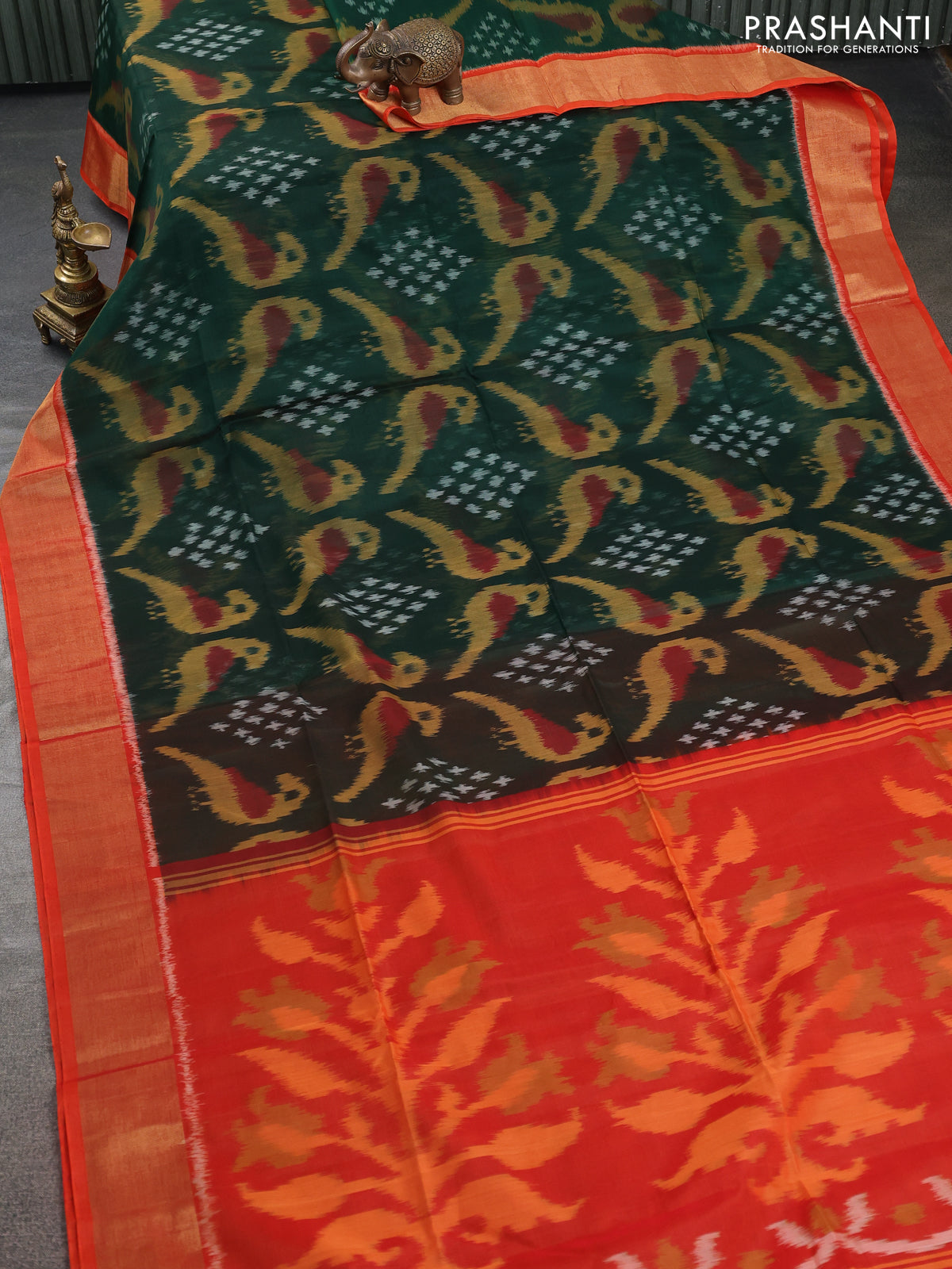 Ikat silk cotton saree green and orange with allover ikat weaves and zari woven border