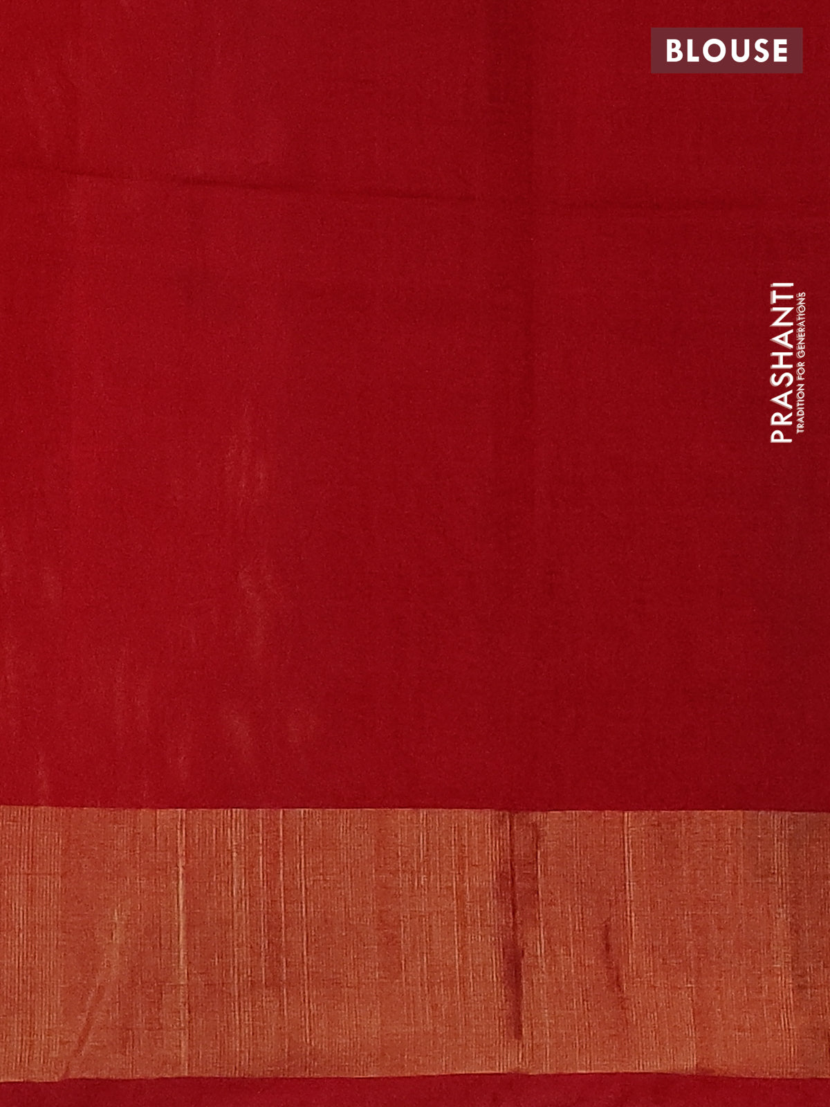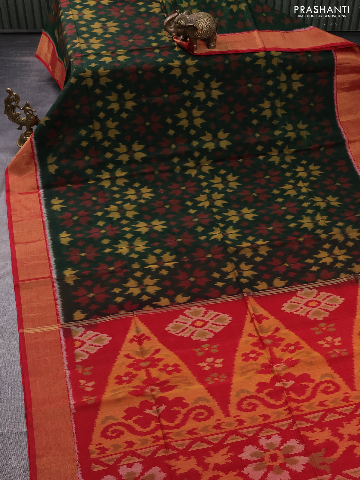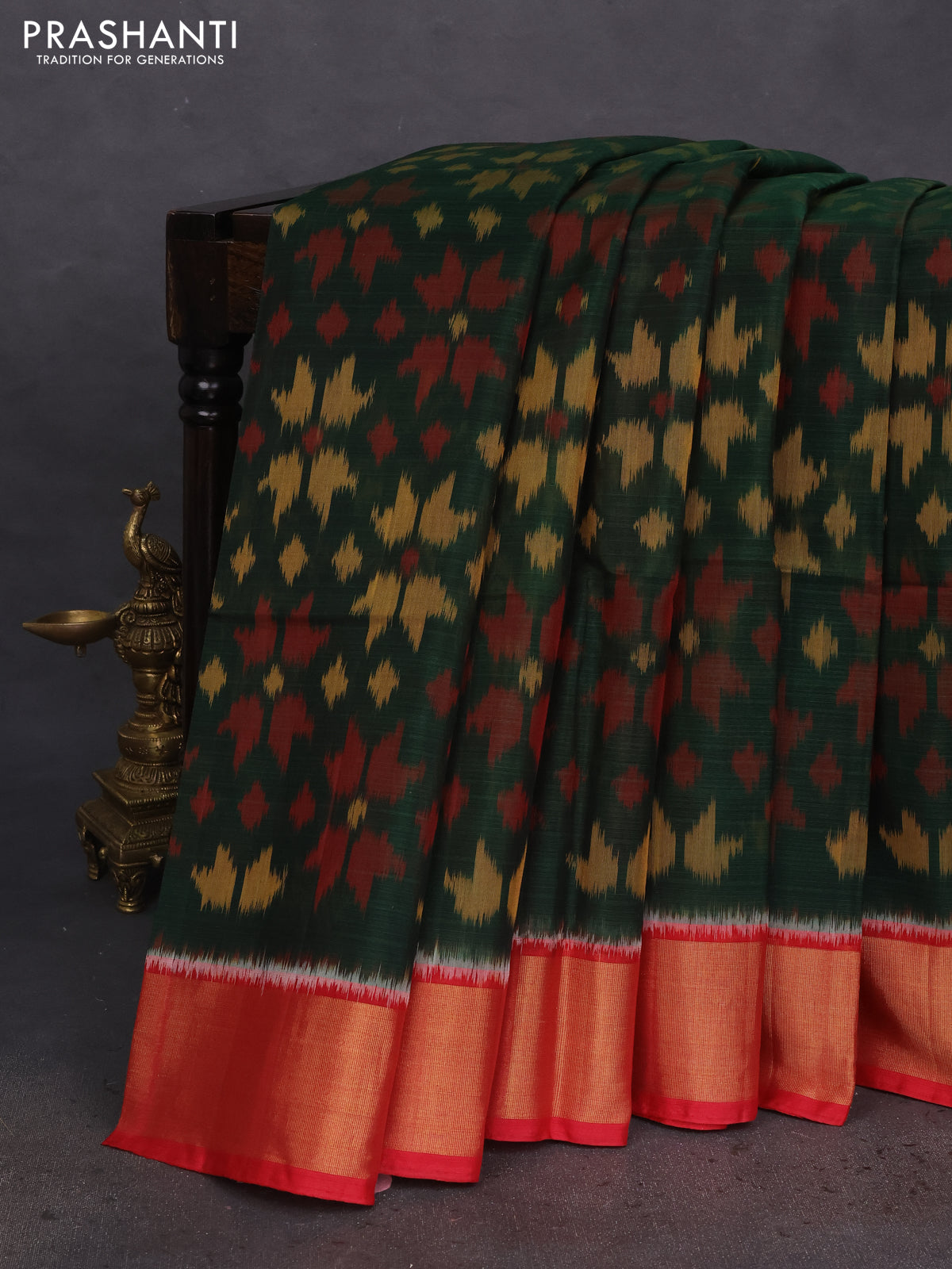 Ikat silk cotton saree green and red with allover ikat weaves and zari woven border