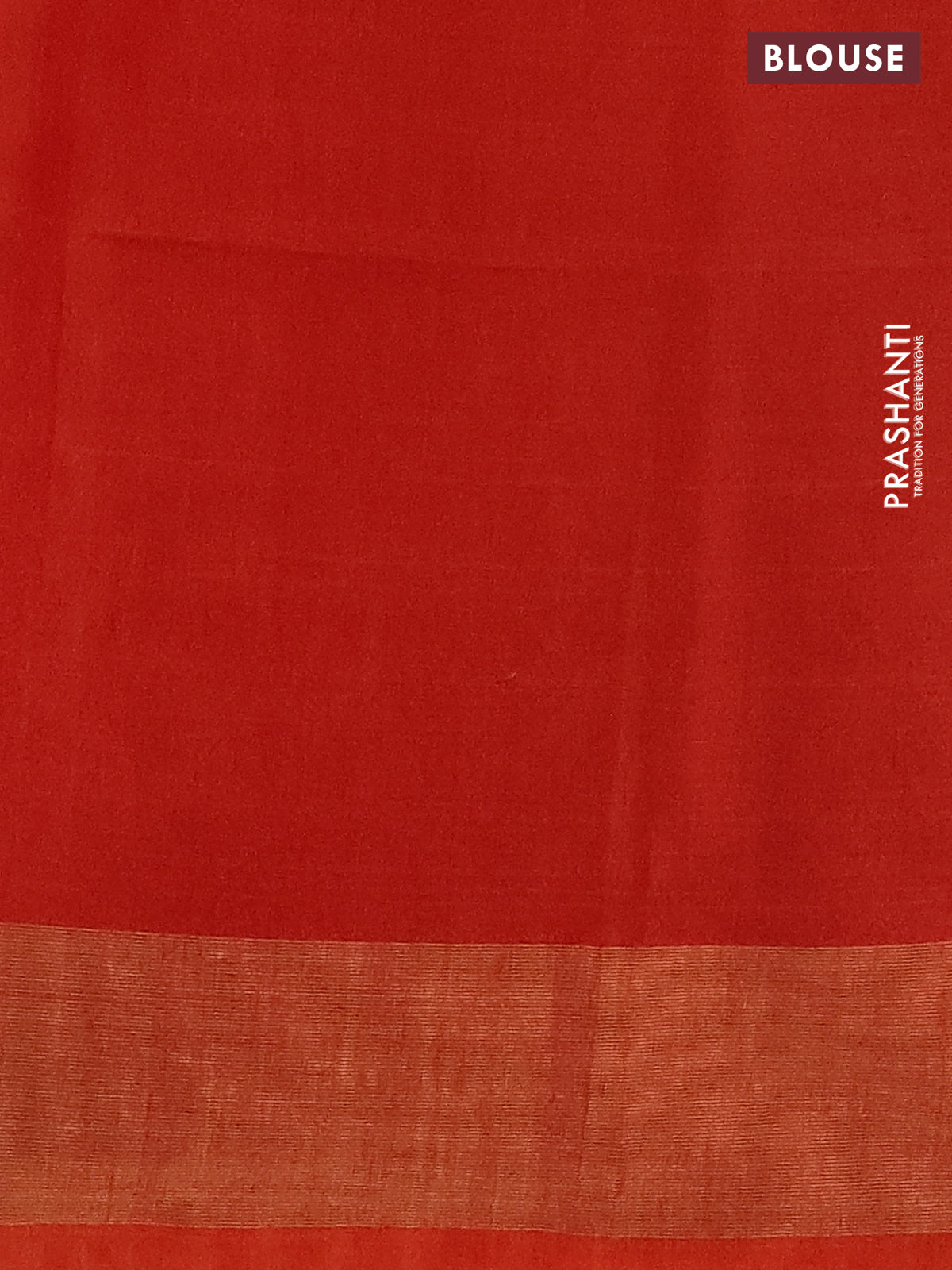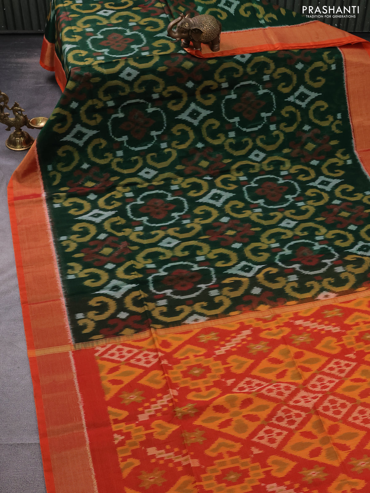 Ikat silk cotton saree green and reddish orange with allover ikat weaves and zari woven border
