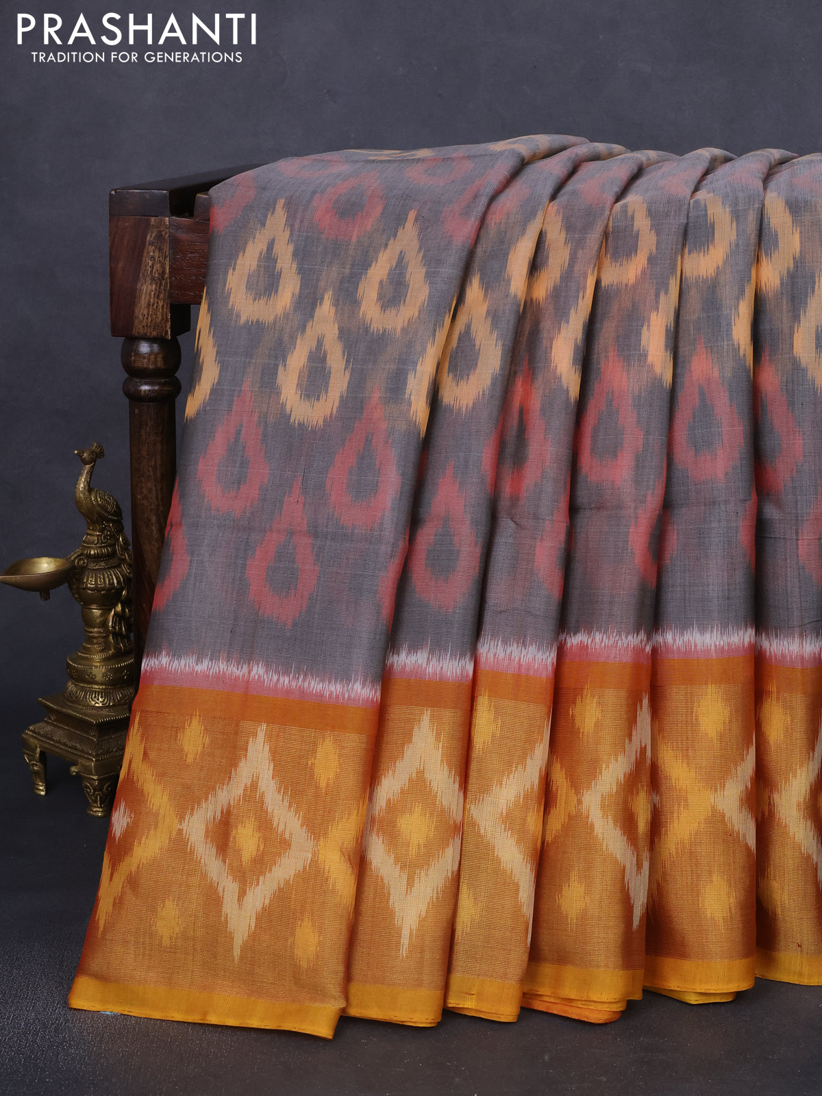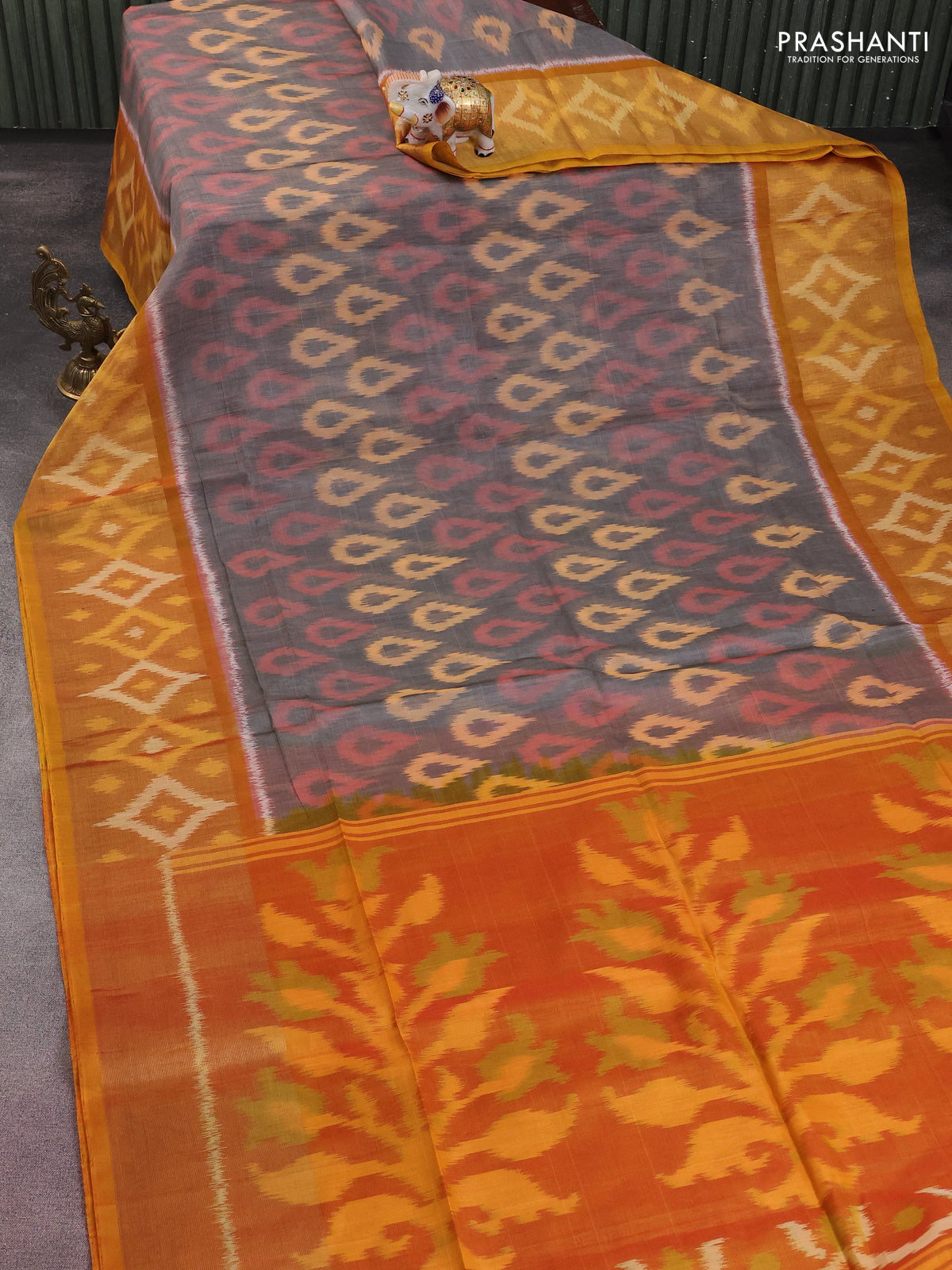 Ikat silk cotton saree grey and mustard yellow with allover ikat weaves and long zari woven ikat border