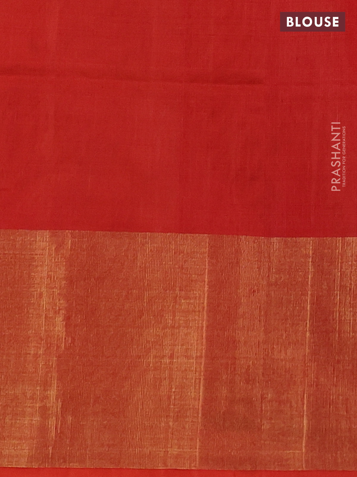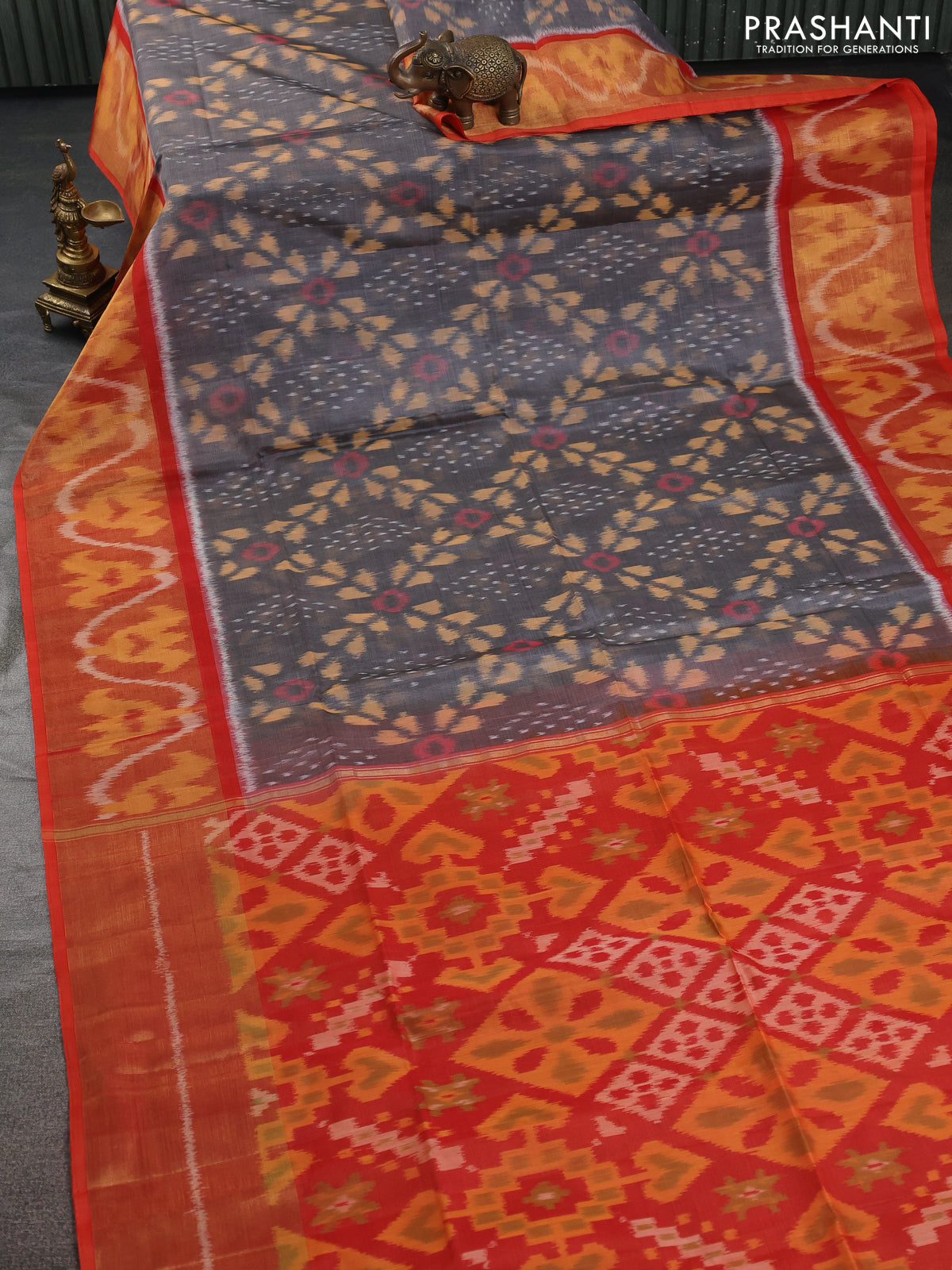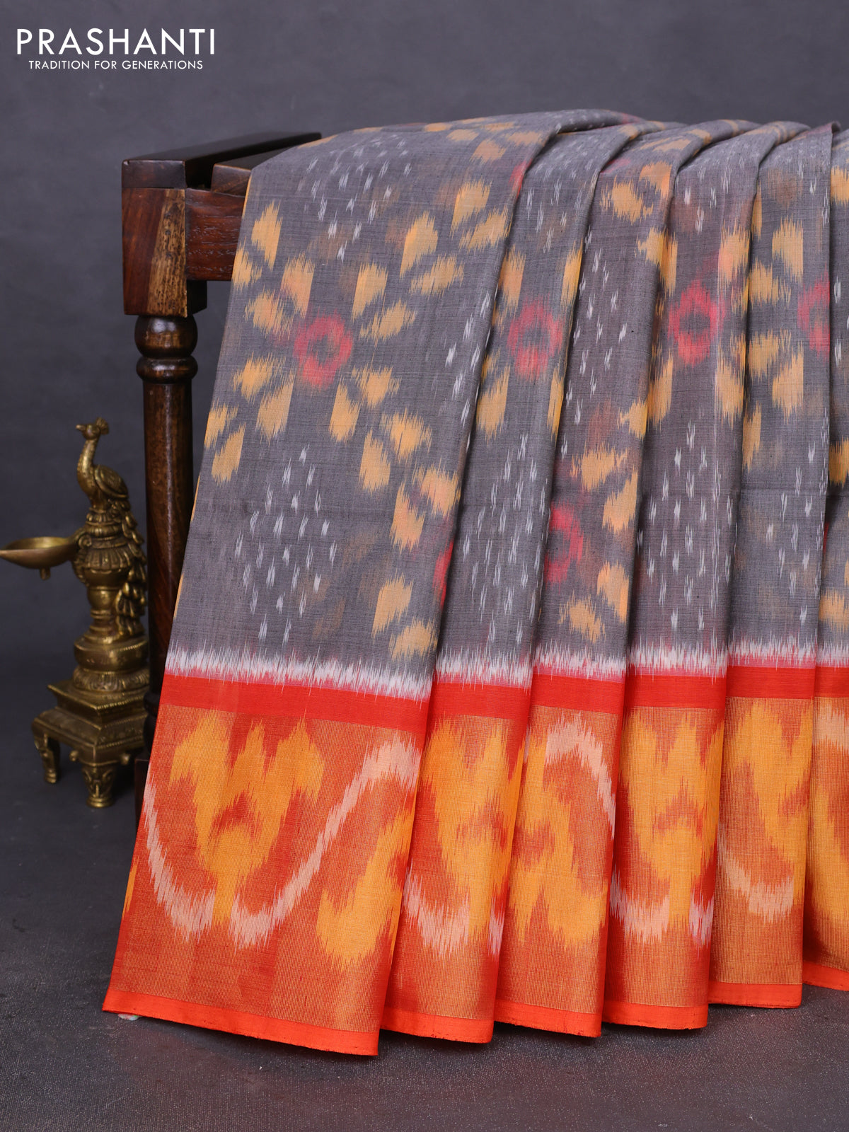 Ikat silk cotton saree grey and orange with allover ikat weaves and ikat woven zari border