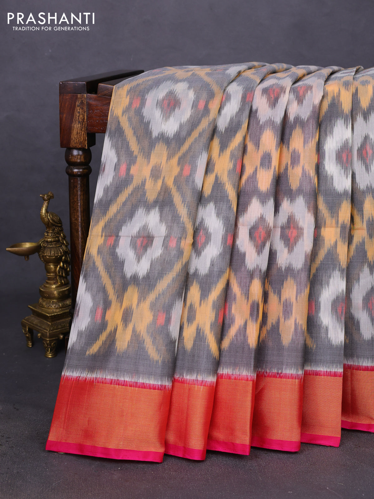 Ikat silk cotton saree grey and pink with allover ikat weaves and zari woven border
