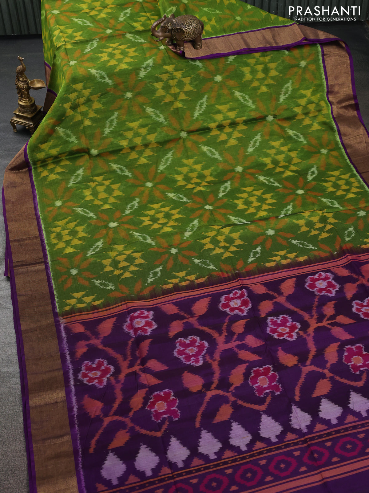 Ikat silk cotton saree light green and violet with allover ikat weaves and zari woven border