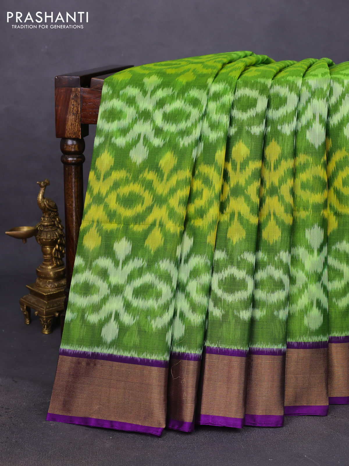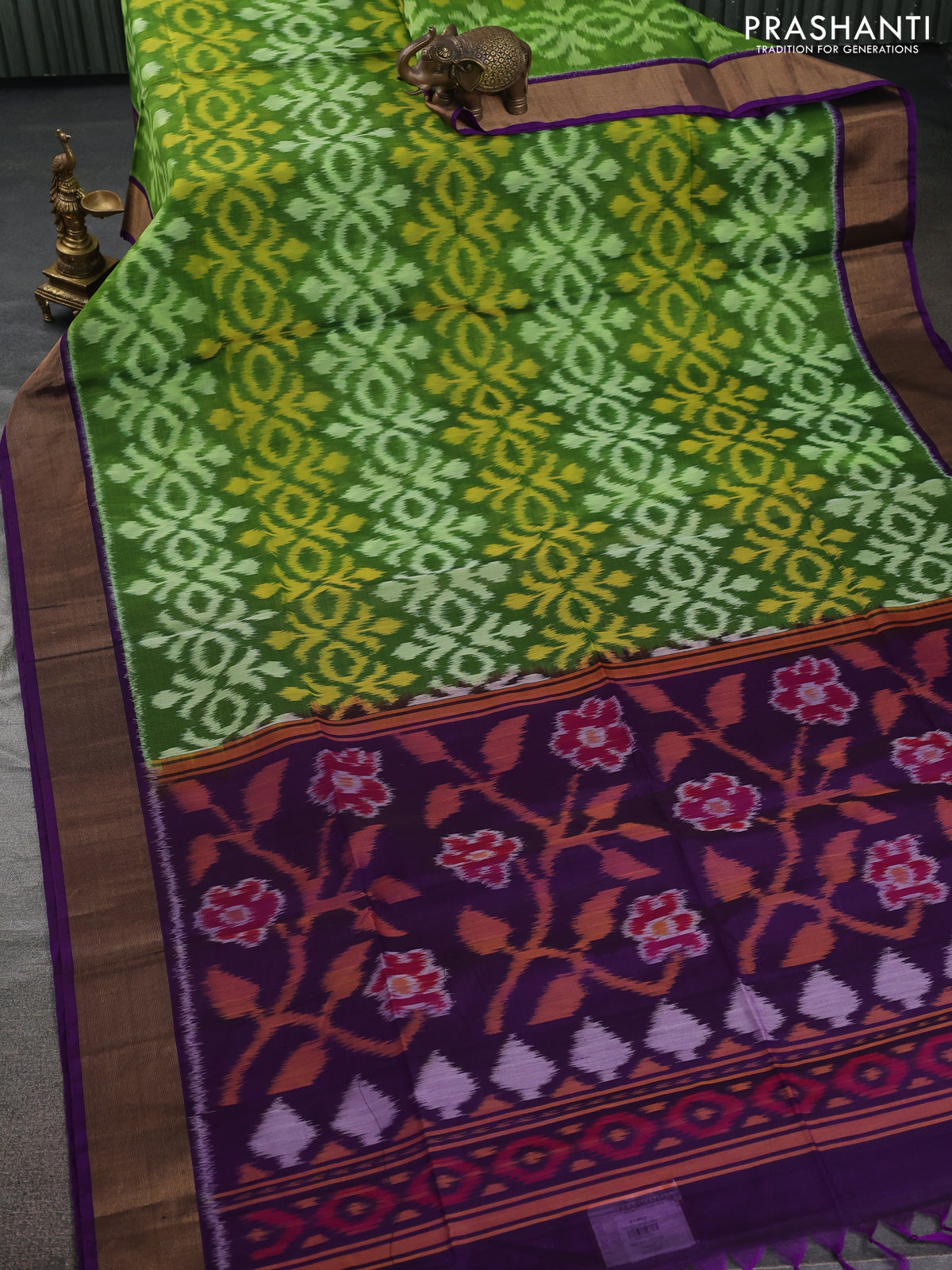 Ikat silk cotton saree light green and violet with allover ikat weaves and zari woven border