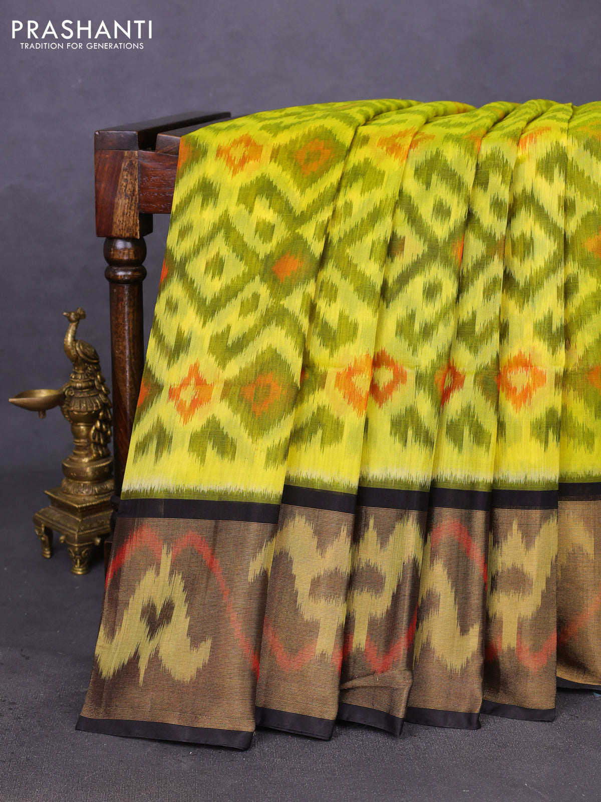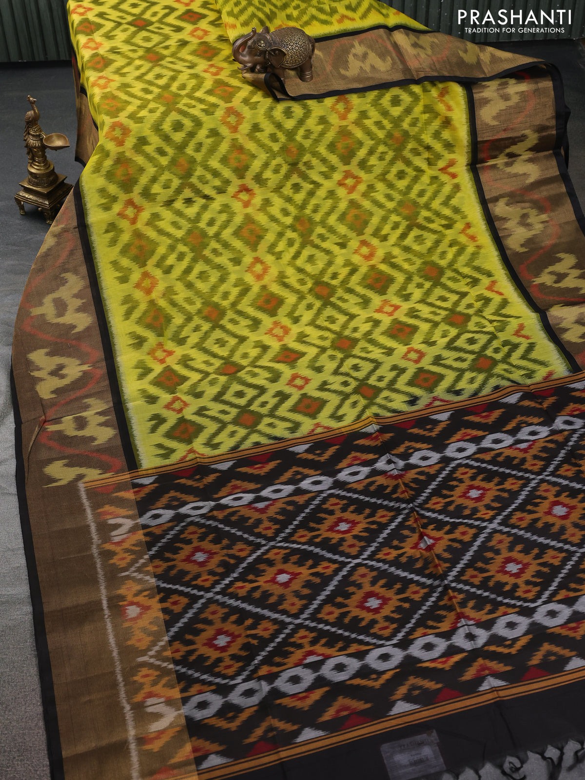 Ikat silk cotton saree lime yellow and black with allover ikat weaves and ikat woven zari border