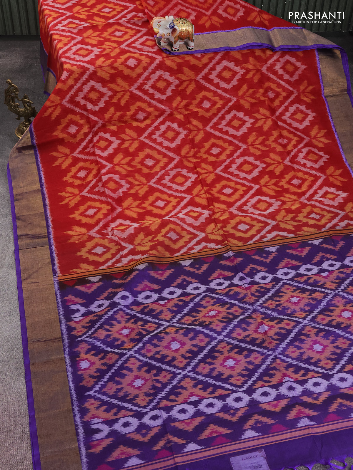 Ikat silk cotton saree maroon and violet with allover ikat weaves and zari woven border
