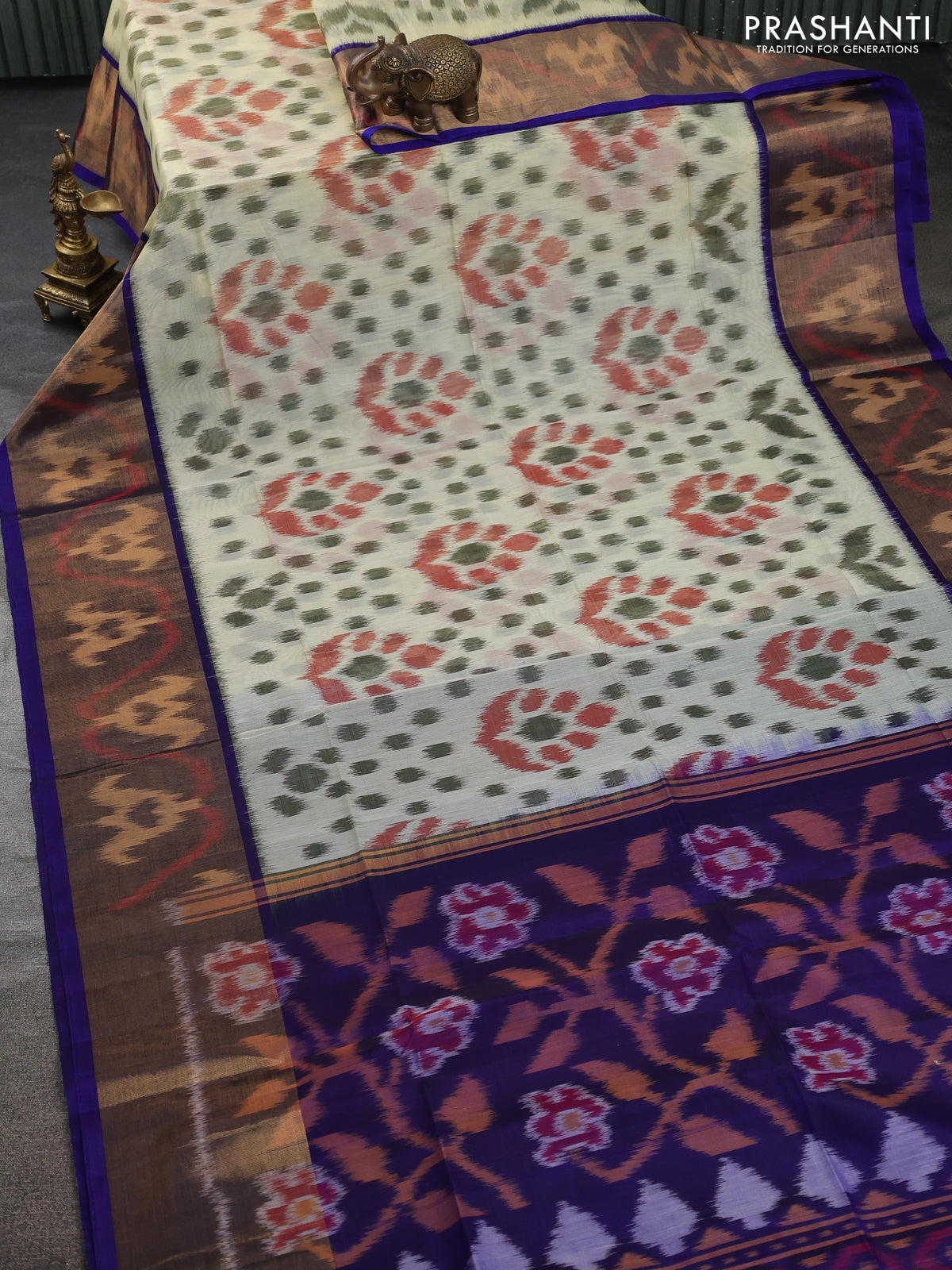 Ikat silk cotton saree mild pista green and blue with allover ikat weaves and ikat woven zari border