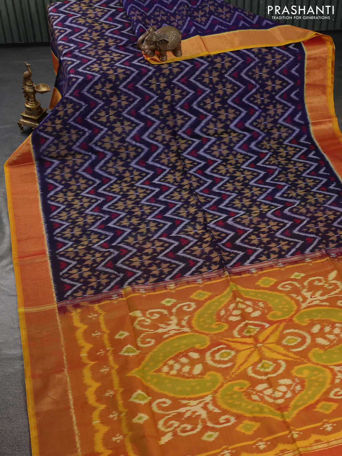 Ikat silk cotton saree navy blue and yellow with allover ikat weaves and zari woven border