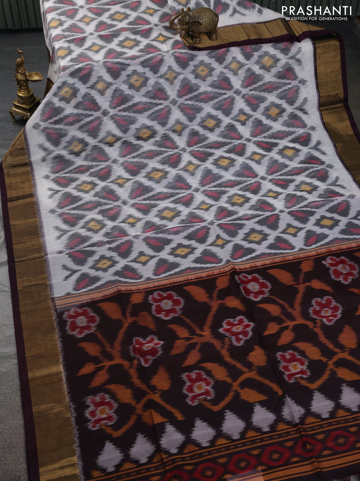 Ikat silk cotton saree off white and deep coffee brown with allover ikat weaves and zari woven border