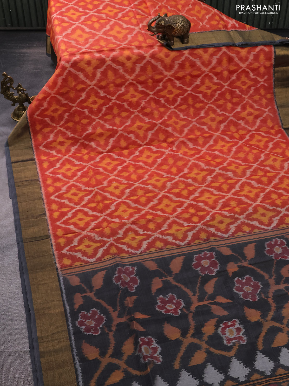 Ikat silk cotton saree orange and grey with allover ikat weaves and zari woven border