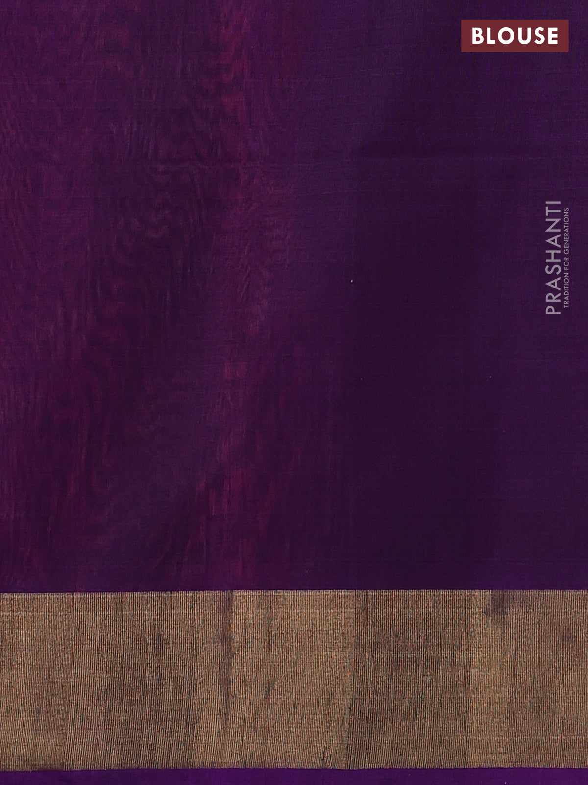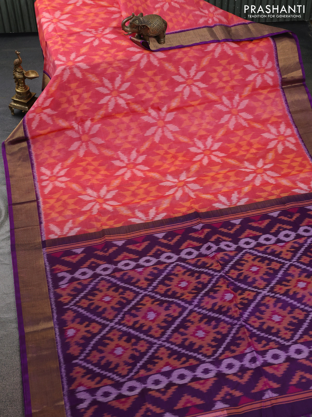 Ikat silk cotton saree peach orange and violet with allover ikat weaves and zari woven border
