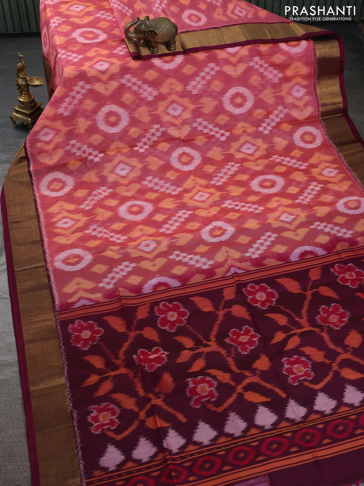 Ikat silk cotton saree peach pink and dark magenta pink with allover ikat weaves and zari woven border