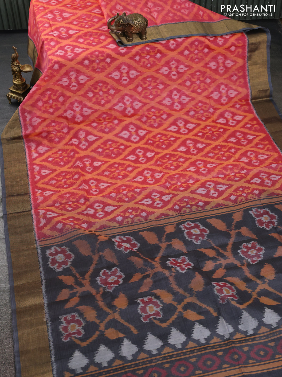 Ikat silk cotton saree peach pink and grey with allover ikat weaves and zari woven border