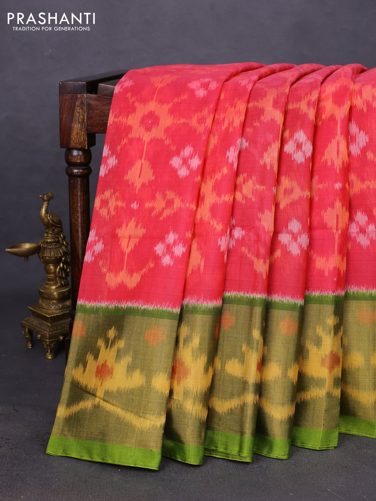 Ikat silk cotton saree pink and light green with allover ikat weaves and ikat woven zari border