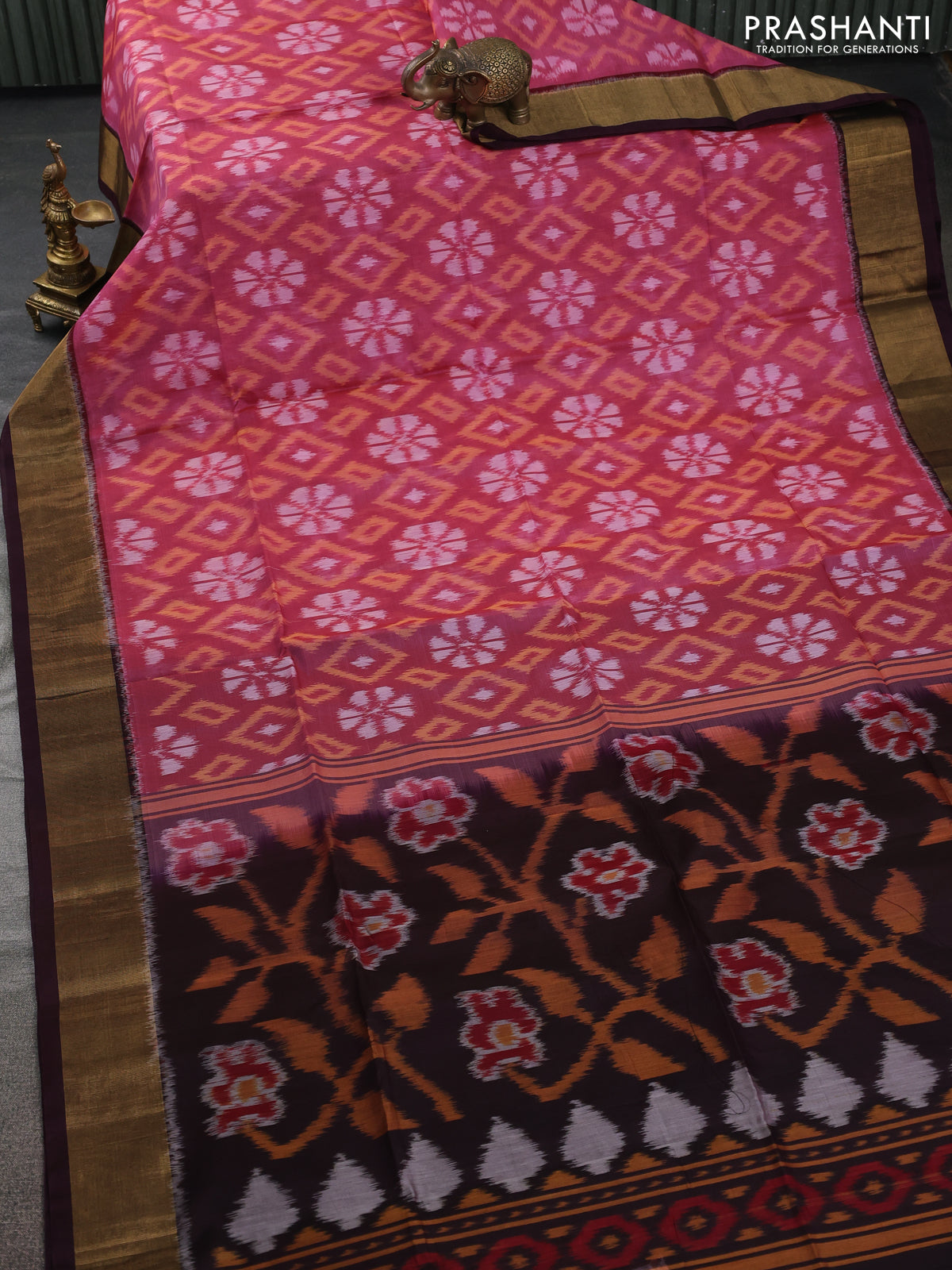 Ikat silk cotton saree pink shade and coffee brown with allover ikat weaves and zari woven border