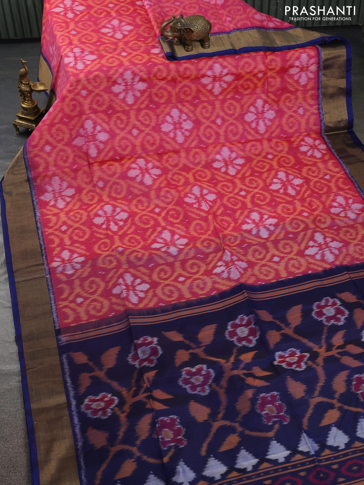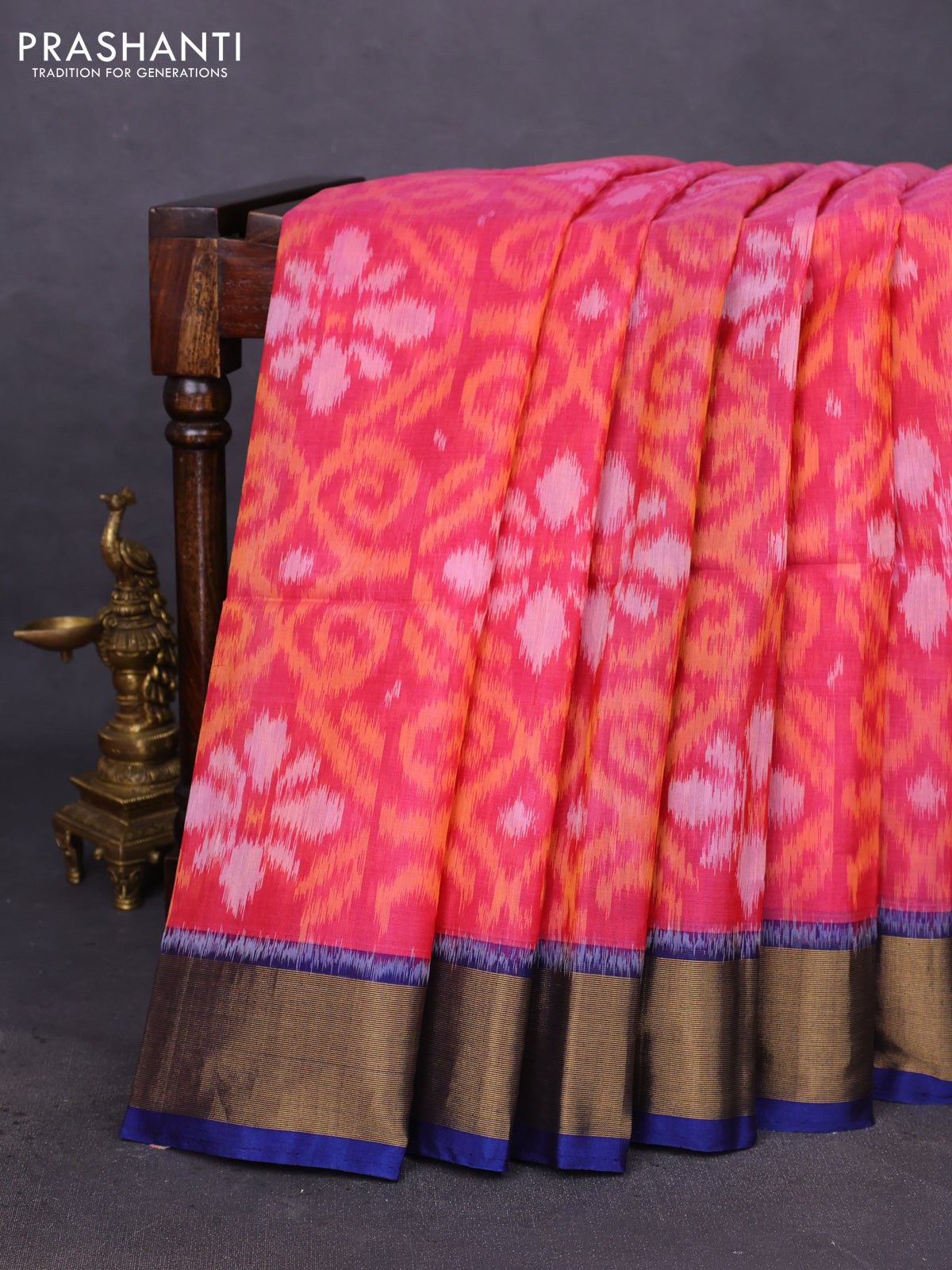 Ikat silk cotton saree pink shade and peacock blue with allover ikat weaves and zari woven border
