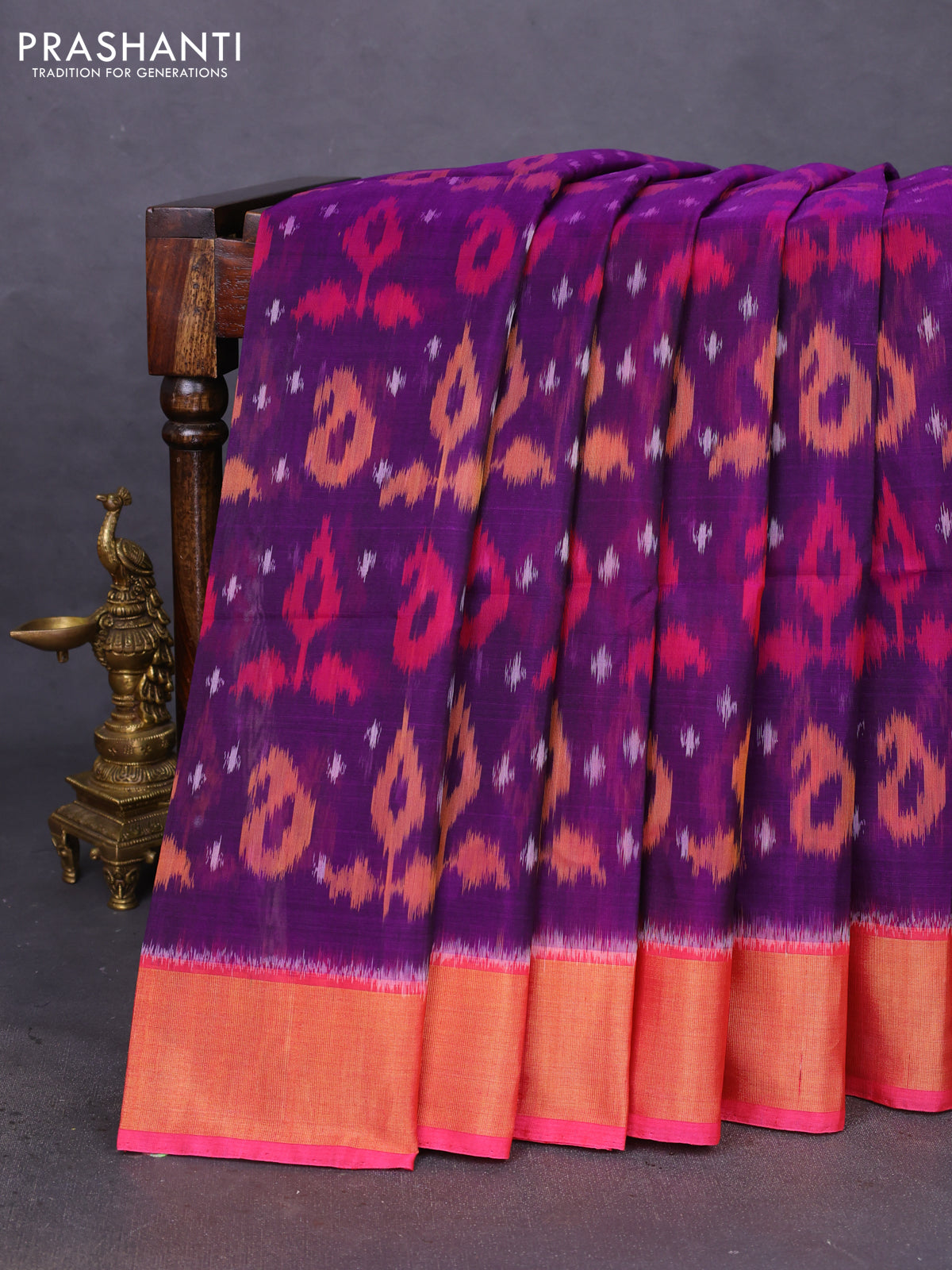 Ikat silk cotton saree violet and pink with allover ikat weaves and zari woven border
