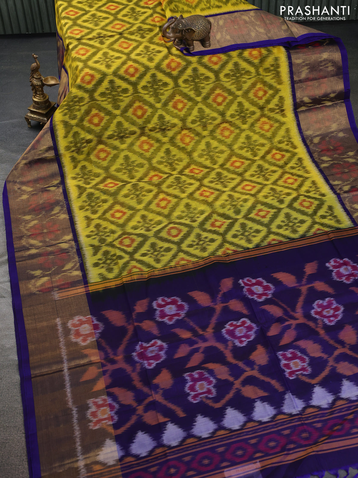 Ikat silk cotton saree yellow and blue with allover ikat weaves and ikat woven zari border