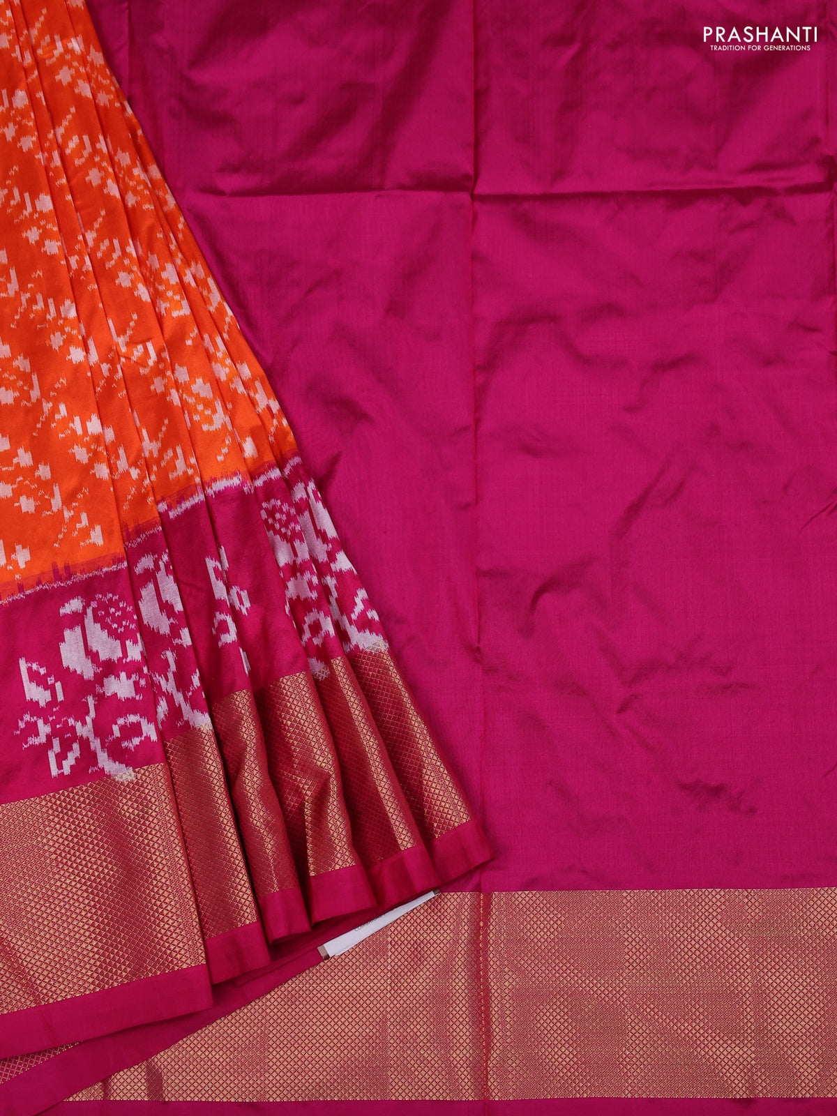 Ikat silk kids lehenga orange and pink with allover ikat weaves and long ikat woven zari border